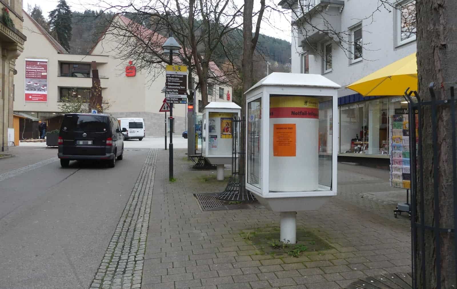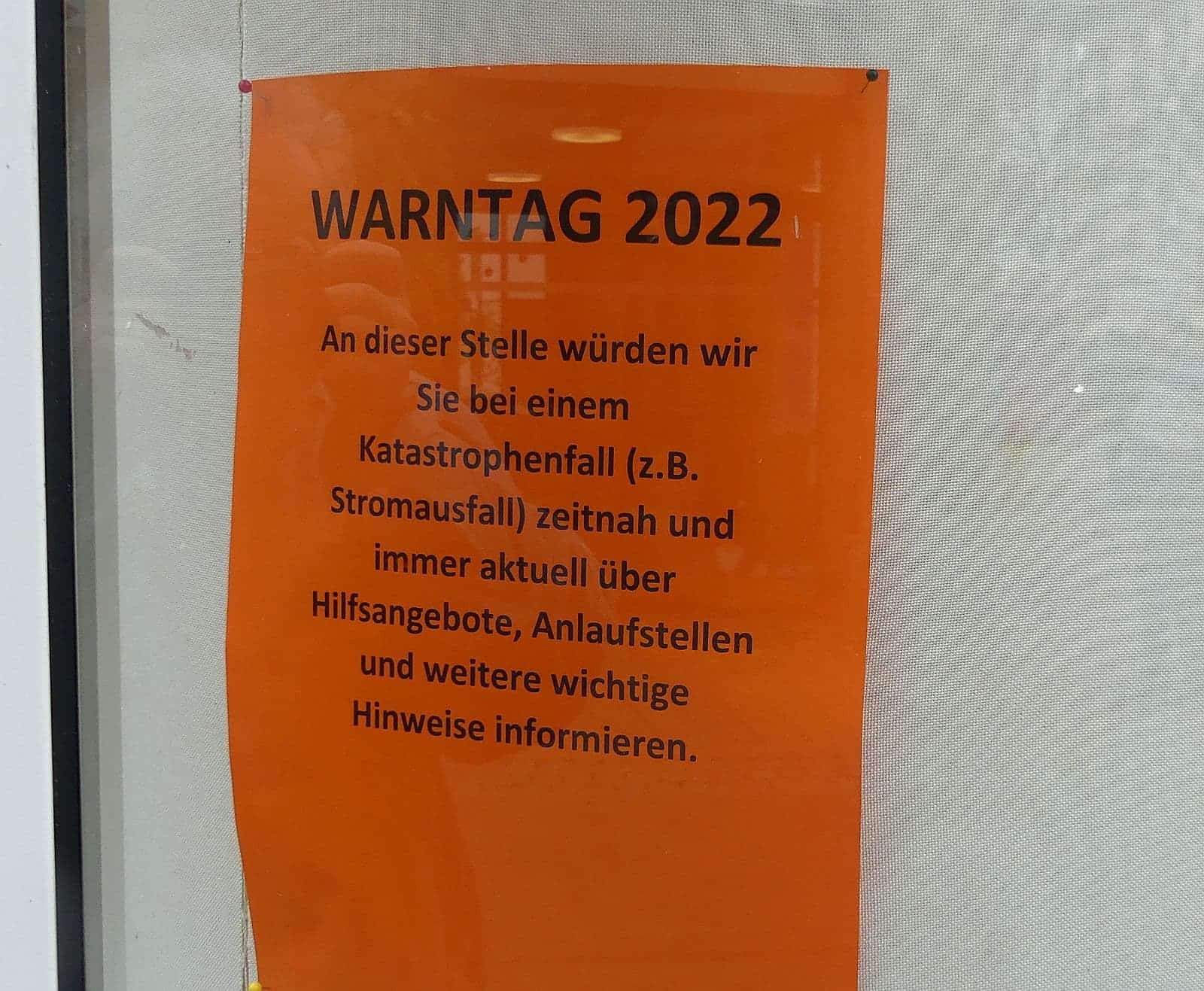 Am Schaukasten tut sich derweil nichts. Auf orangeroten Plakaten der Hinweis, dass die Stadt im echten Notfall hier informieren würde.