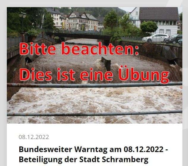 Schramberg, 10.59 Uhr. Am Schaukasten zwischen Rathaus und Schinle warten drei Presseleute, ob wohl jemand von der Stadt am Notfall-Informationspunkt vorbeischaut. Da rattert ein unangenehmer Ton auf dem Smartphone eines Kollegen. „Ok, das war die Warnmeldung.“ Nur eine Probewarnung, steht da. „Es besteht keine Gefahr.“