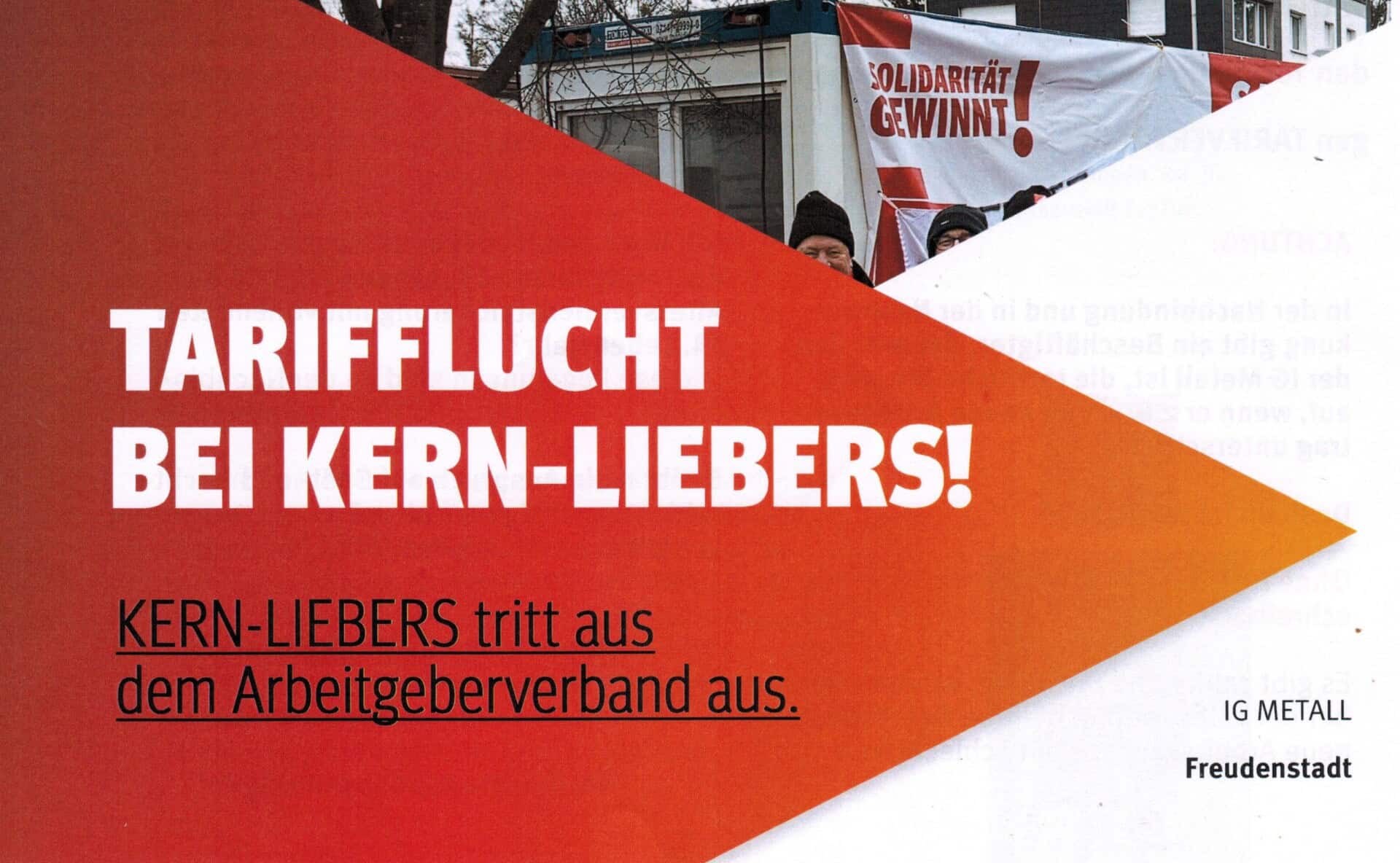 Schramberg. Kern-Liebers kommt nicht zur Ruhe. Nach der Ankündigung des Vorsitzenden der Geschäftsleitung von Kern-Liebers Erek Speckert, den Arbeitgeberverband zu verlassen, wird es am Montag eine außerordentliche Betriebsversammlung geben. Bereits heute hat die IG Metall zum Beginn der Frühschicht ein Flugblatt verteilt.