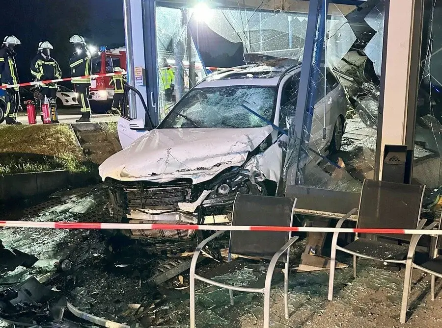 Beim Versuch, nach rechts abzubiegen, habe die junge Fahrerin dann die Kontrolle über das Auto verloren, es kam nach links von der Fahrbahn ab und fuhr in ein angrenzendes Autohaus. Dabei durchbrach der Mercedes die Scheibe sowie einen Stützbalken des Gebäudes und stieß gegen einen ausgestellten Neuwagen. Umherfliegende Trümmerteile beschädigten noch ein weiteres auf dem Hof des Autohauses abgestellten Fahrzeug, wie die Polizei weiter mitteilt.