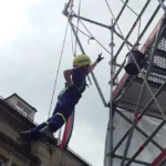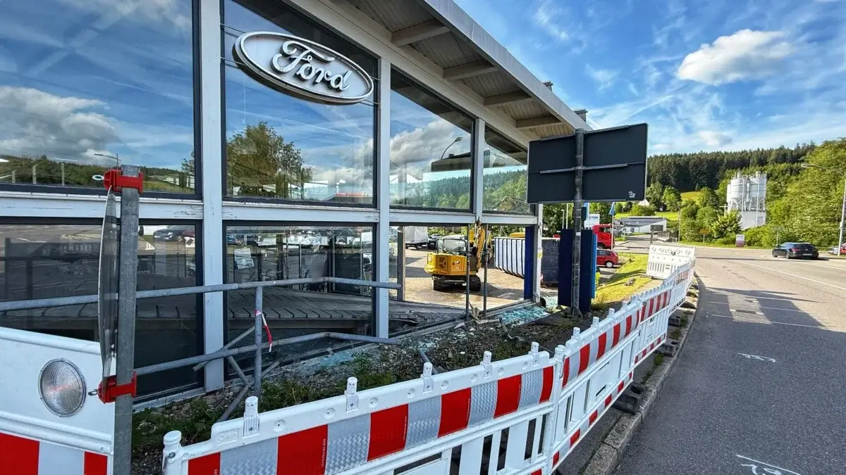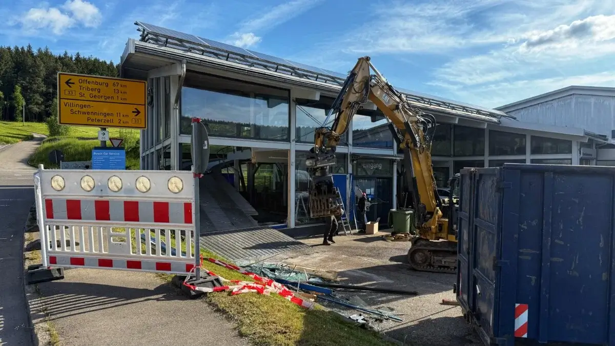 Da das Gebäude des Autohauses nach dem Verkehrsunfall einsturzgefährdet war, stützte es die Freiwillige Feuerwehr St. Georgen noch in der Nacht ab. Am Morgen nach dem Unfall waren die umfangreichen Aufräumarbeiten bereits in vollem Gang. Ein Teil des Ausstellungsraums des Autohauses ist schwer beschädigt, mithilfe eines Baggers werden die Bauteile nun in einen Container verladen.