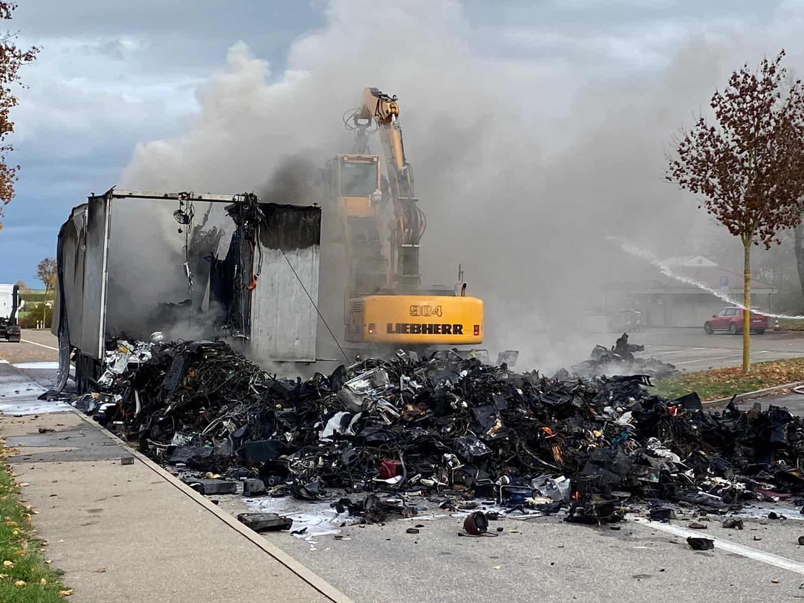 Der Lkw-Fahrer schaffte es noch auf einen Parkplatz. Dort brannte der mit Elektroschrott beladene Anhänger völlig aus. Die Ursache ist noch nicht bekannt. Das Unglück passierte auf Höhe Horb. Die dortige Feuerwehr ist alarmiert worden.