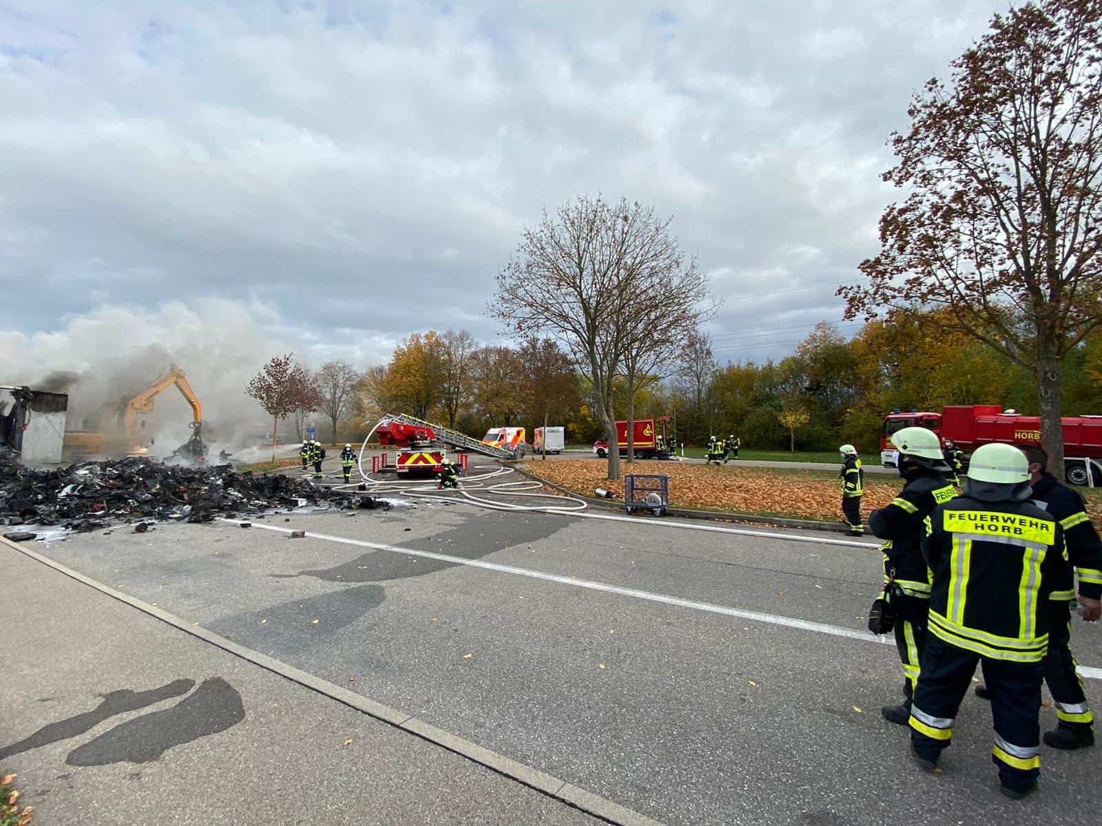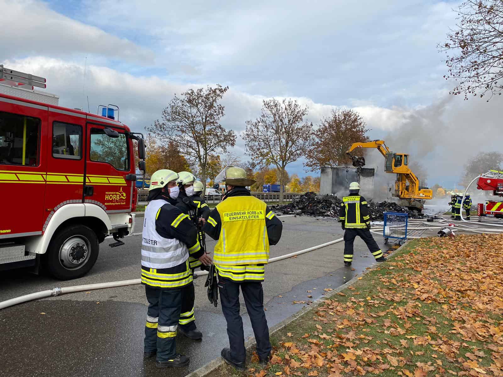 Inzwischen soll ein hinzugezogener Bagger den brennenden Schrott auseinanderziehen, um ihn besser ablöschen zu können. Der Parkplatz bleibt bis zum Ende der Löscharbeiten gesperrt. Der Verkehr auf der A 81 ist nicht von den Einsatzarbeiten betroffen, die Strecke dort ist frei.