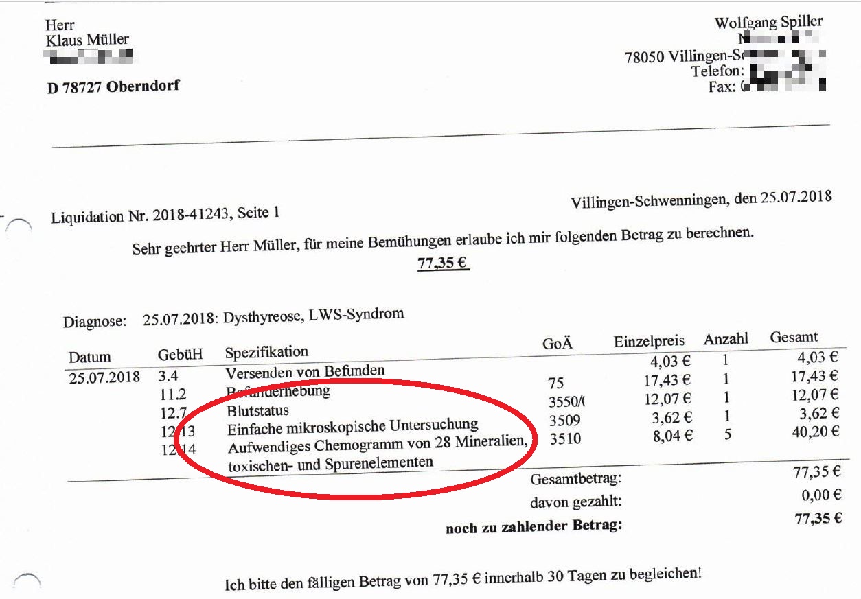 Dr. Müller verzichtet auf eine Sammelbestellung. Vielmehr bittet er Wolfgang Spiller um eine Erklärung, denn auf Spillers Rechnung vom 25. Juli 2018 sind vermerkt: „Blutstatus“, „einfache mikroskopische Untersuchung“ und „aufwendiges Chemogramm von 28 Mineralien, toxischen und Spurenelementen“.