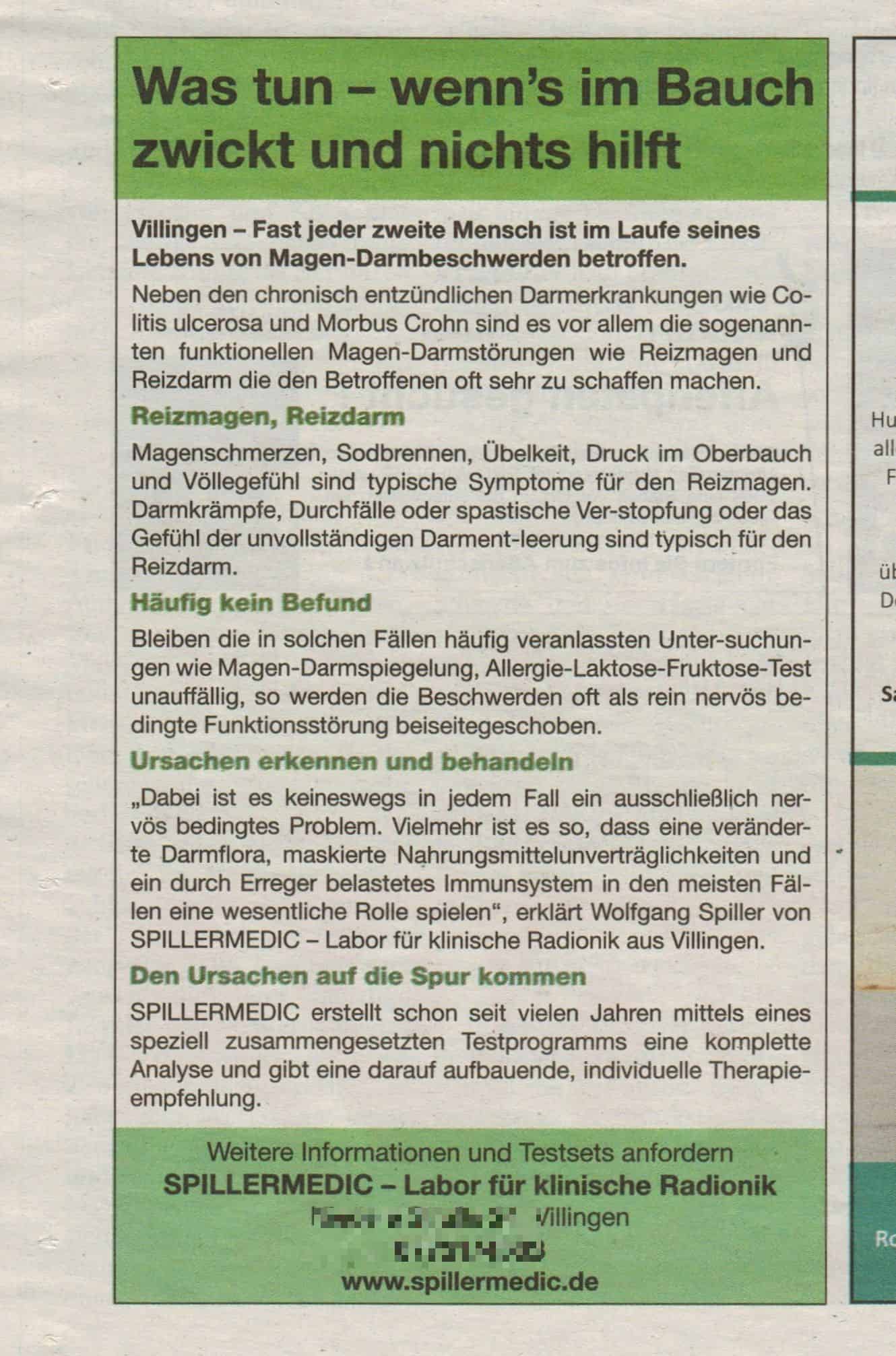 Seit vielen Jahren erscheinen – auch in der NRWZ – Anzeigen von „Spillermedic-Labor für Klinische Radionik in Villingen: „Was tun – wenn’s im Bauch zwickt und nichts hilft“ steht da. Wolfgang Spiller erklärt in der Anzeige, Ursache könnte eine „maskierte Lebensmittelunverträglichkeit“ oder ein „durch Erreger belastetes Immunsystem“ sein. Solchen Ursachen komme er mittels eines speziellen Testprogrammes auf die Spur. Er gebe „eine darauf aufbauende individuelle Therapieempfehlung“. In einem Spillermedic-Prospekt heißt es: „Zur Analyse benötigen wir einen Tropfen Blut.“