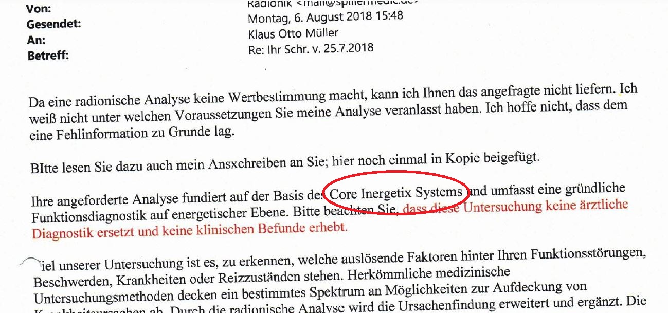 Der antwortet laut einer Mail an Müller kurz und knapp: „Da eine radionische Blutanalyse versicherungstechnisch nicht anerkannt wird, verschicken wir bei Privatpatienten sogenannte ‚Analogziffern‘“. Er werde Klaus Müller gern eine korrigierte Rechnung schicken, die dieser dann aber wohl nicht erstattet bekomme.