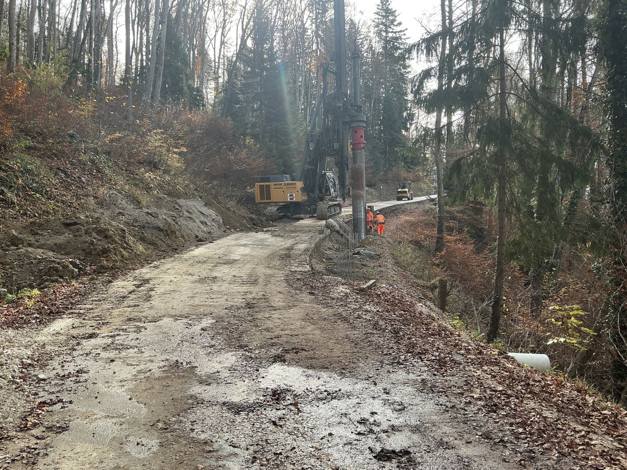 Grund für die zeitliche Verzögerung sind technische Komplikationen bei der Hangsicherung. Hier ist derzeit ein Großbohrgerät im Einsatz, das 42 Betonpfähle in den Untergrund gebohrt. Da die die Standfestigkeit der Straße weniger gut ist als ursprünglich angenommen, gehen die Arbeiten langsamer voran. Derzeit gehen das RP und die beauftragte Firma davon aus, dass die Hangsicherung vor Weihnachten abgeschlossen werden kann. Im Frühjahr müssen dann noch die Asphaltarbeiten erfolgen. Über die provisorische Öffnung der Straße wird das RP vor Weihnachten rechtzeitig informieren.
