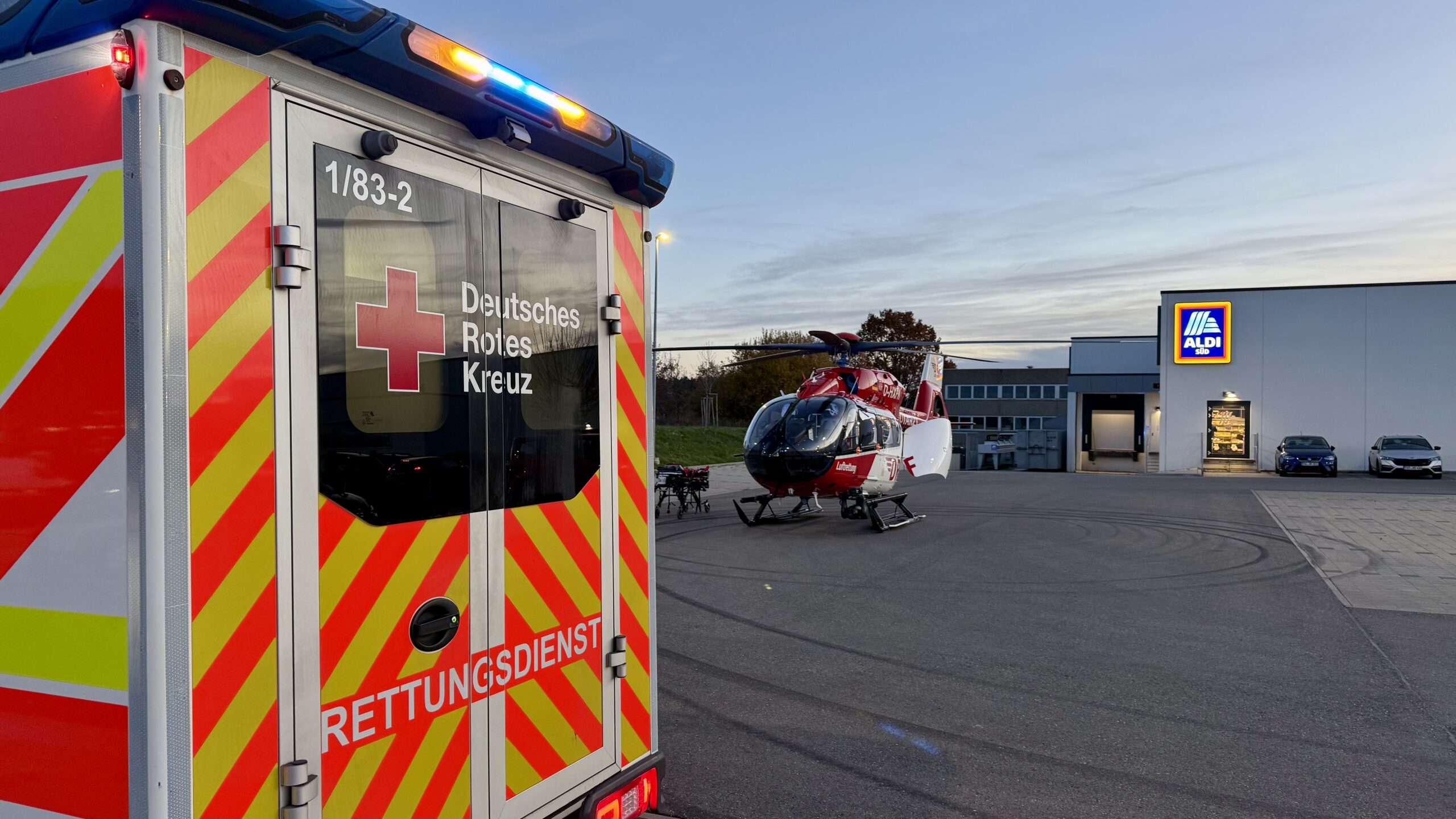 Rendezvous auf dem Aldi-Parkplatz in Rottweil: Ein Rettungswagen des DRK und der Rettungshubschrauber Christoph 11 der Deutschen Rettungsflugwacht…