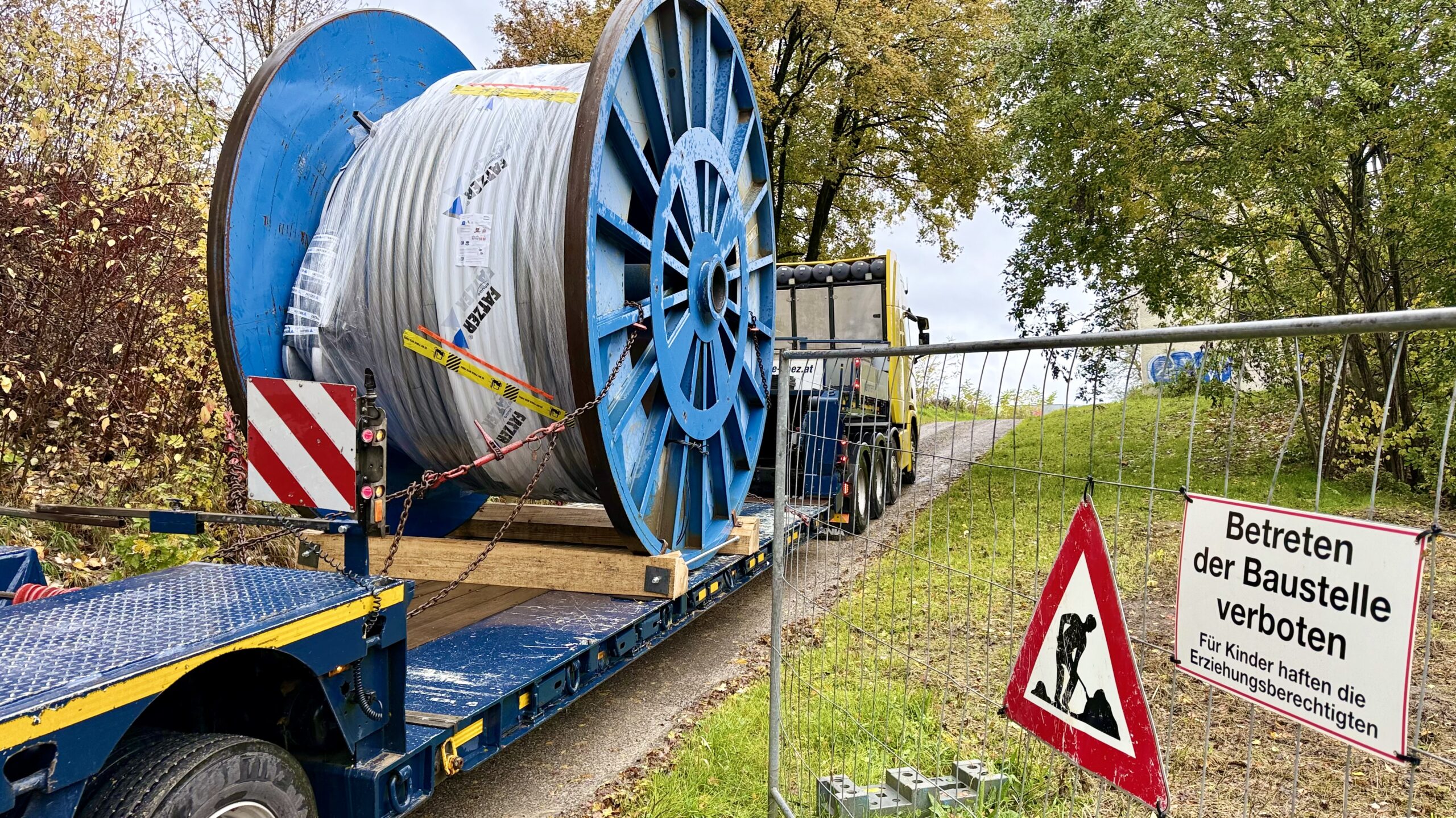 Auf zwei Tiefladern und aufgerollt auf riesigen Rollen kamen sie am Donnerstag an: die Tragseile der künftigen Fußgänger-Hängebrücke,…