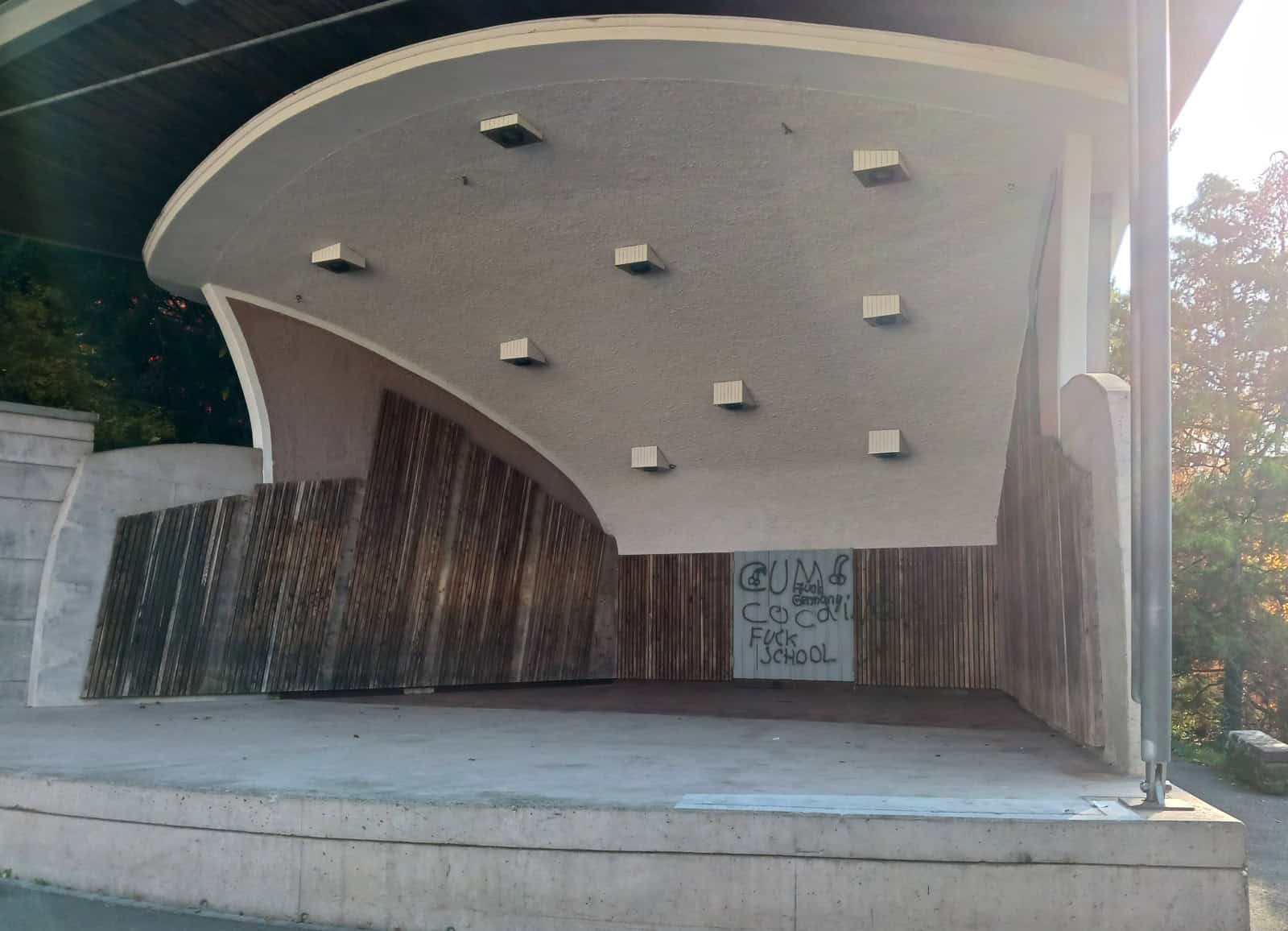 Unbekannte haben Parolen und obszöne Zeichnungen an die Rückwand der Konzertmuschel im Park der Zeiten geschmiert. Schramberg. Der…