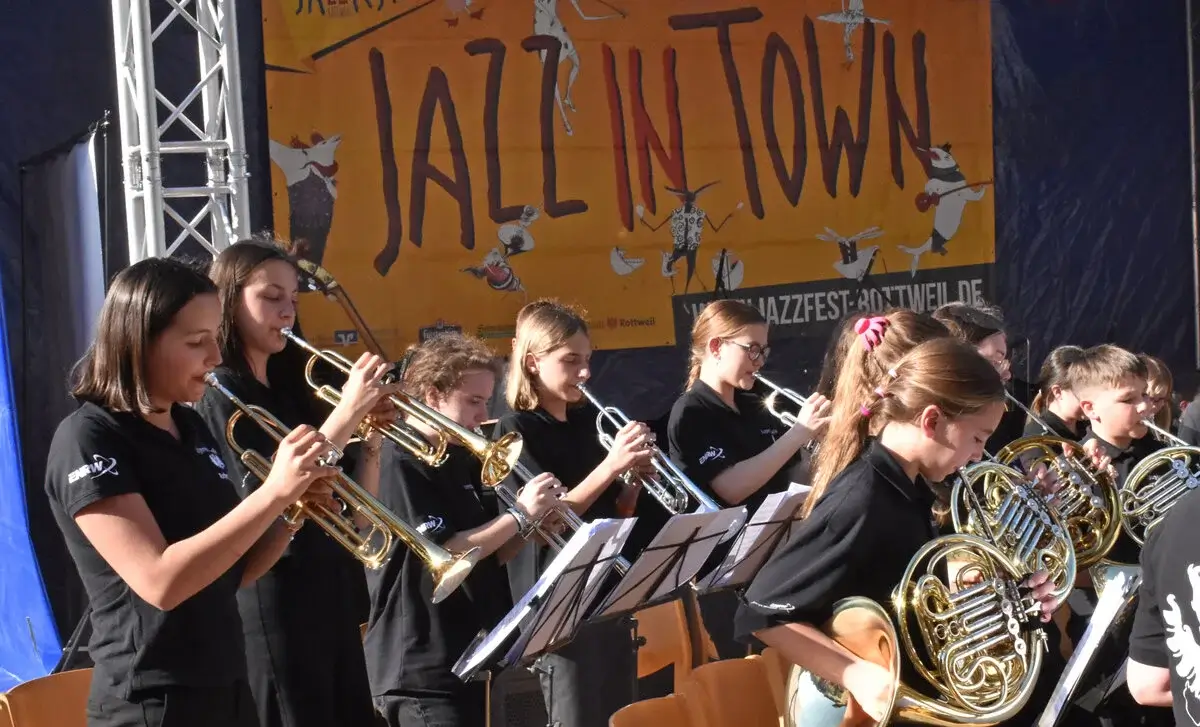 Start bei sonnigem Wetter: Die Jugend der Stadtkapelle Rottweil unter Dirigent Johannes Nikol spielte zum Auftakt des Jazzfests…