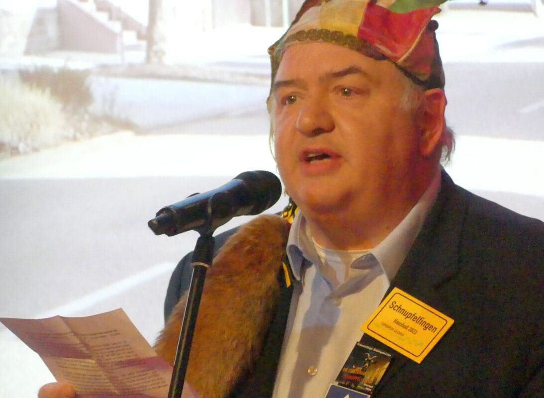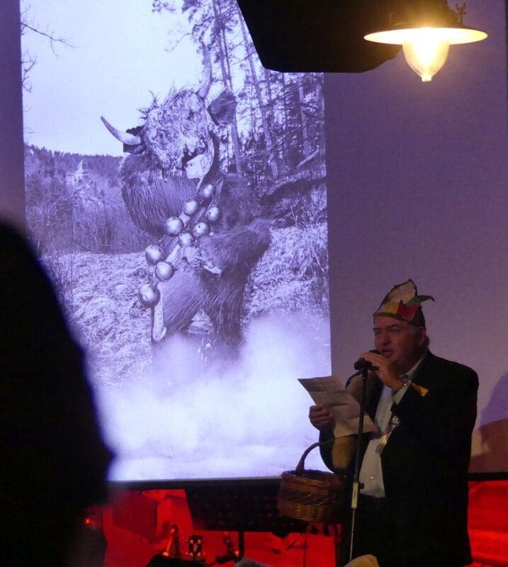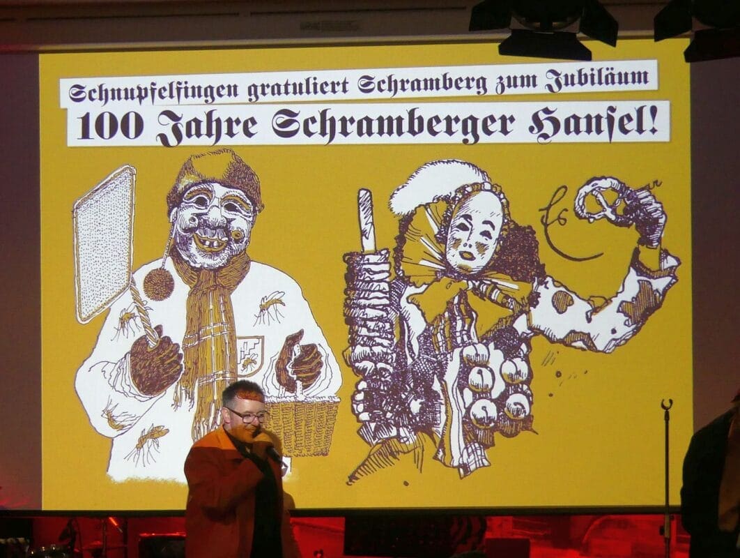 Als nächstes präsentierte Zunftarchivar Carsten Kohlmann die neue Fasnetspostkarte aus Schnupfelfingen. Es ist bereits die dritte Karte, die in diesem Jahr den Schramberger Hansel zu seinem Jubiläum ehren soll. Dieser ist aber schon viel älter, wie ein Dokument über den Kleingütler Johannes N. kürzlich bewies.