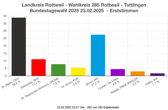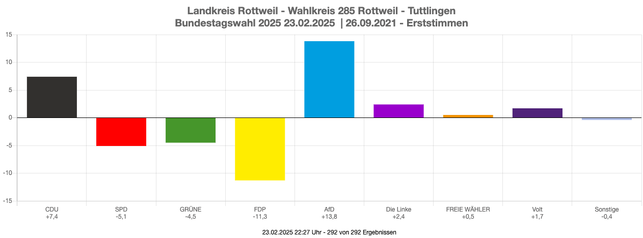 Einen Sprung nach vorn machte die Kandidatin der CDU für den Bundestag, Maria-Lena Weiss, in ihrem Wahlkreis Rottweil-Tuttlingen. 39,9 % der Wählerinnen und Wähler gaben ihr ihre Stimme, 7,4 % mehr als 2021. Einen fast doppelt so großen Sprung machte zudem Joachim Bloch für die AfD. Er errang 27,5 % der Erststimmen, fast 14 % mehr als vor vier Jahren. Damit ist auch er in den Bundestag gewählt – sein 13. Landeslistenplatz sichert ihm den Einzug.