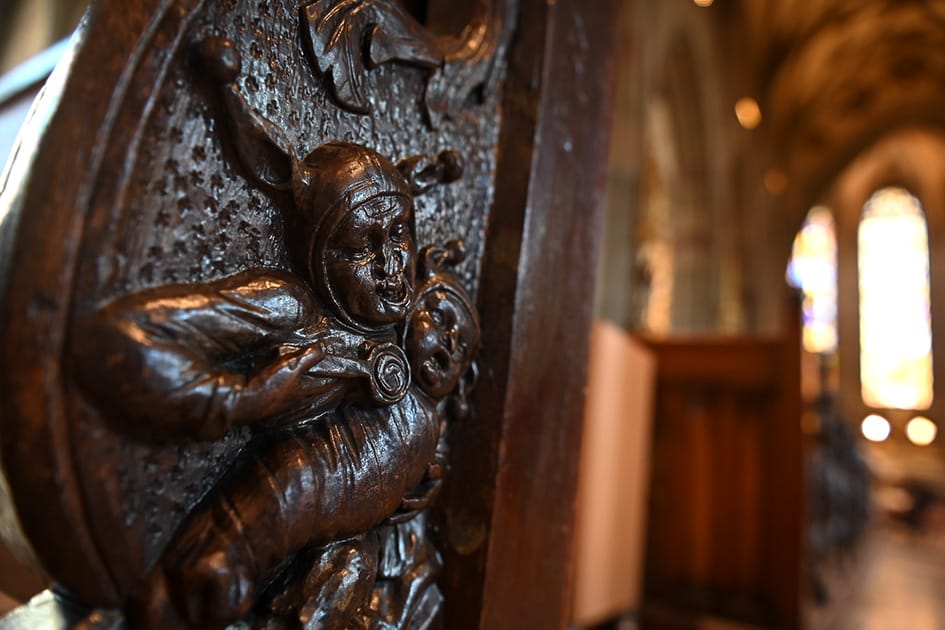 In einem schlanken Band fächert der Mainzer Autor auf, was man im Rottweiler Heilig-Kreuz-Münster jederzeit sehen kann: Dass Fasnet und christlicher Glaube eng miteinander verwoben sind. Im Münster veranschaulicht das die Darstellung der „Narrenmutter“ an einer barocken Stuhlwange: Sie füttert ihr närrisches Kind – Symbol der nie endenden Narretei in der Welt.