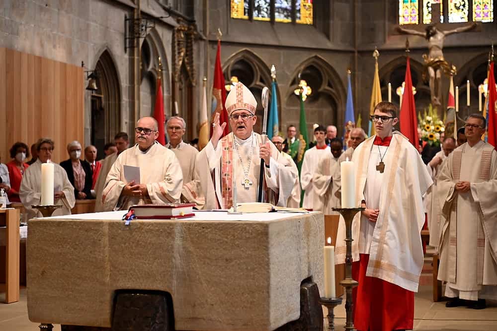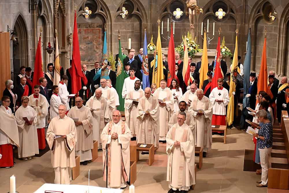 „Was er schuf, was er gebaut, preis ihn laut!“: Wie gemacht für diesen Anlass schien die Hymne, zu der die Festprozession ins Münster einzog. Aus dem Geist einer katholischen Erneuerung wurde sie 1842 gedichtet – just zu der Zeit, als das Münster seine heutige, an der Hochgotik orientierte Gestalt erhielt.