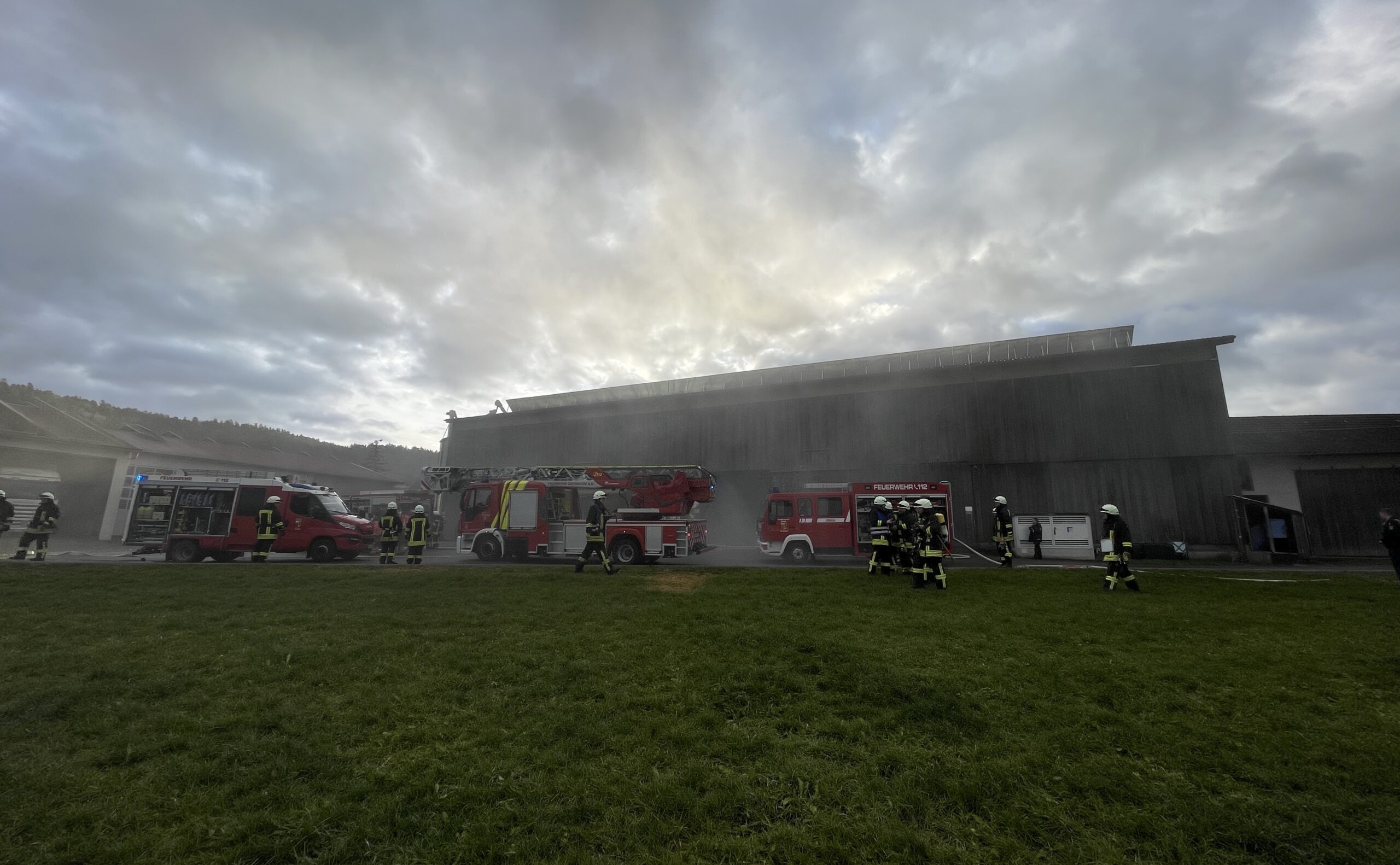 Kräfte der Feuerwehren aus Dietingen und Oberndorf sind vor Ort. Die Wasserversorgung wurde rasch aufgebaut, laut Feuerwehrsprecher Sven Haberer teils aus dem Ort, teils aus einem Löschwasserteich auf dem Gelände des Betriebs.