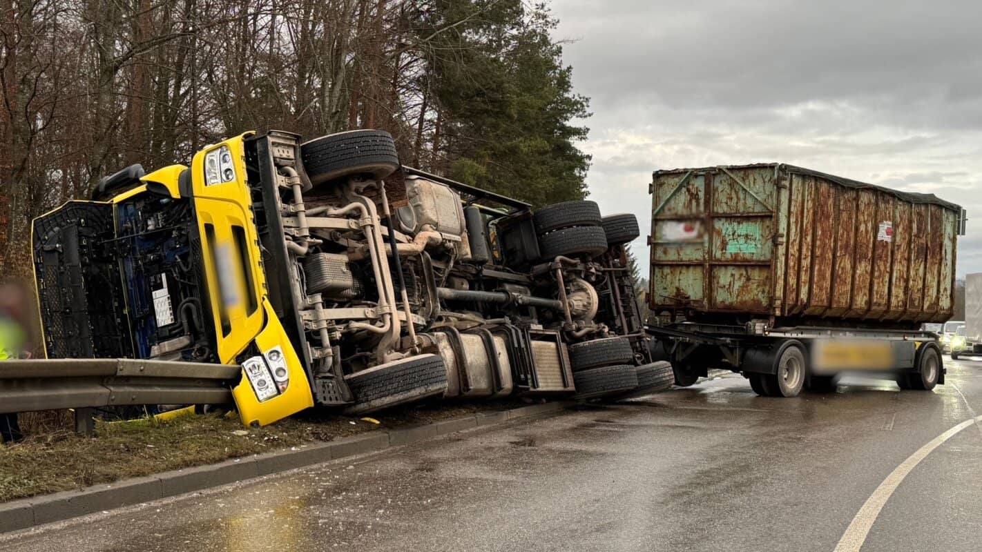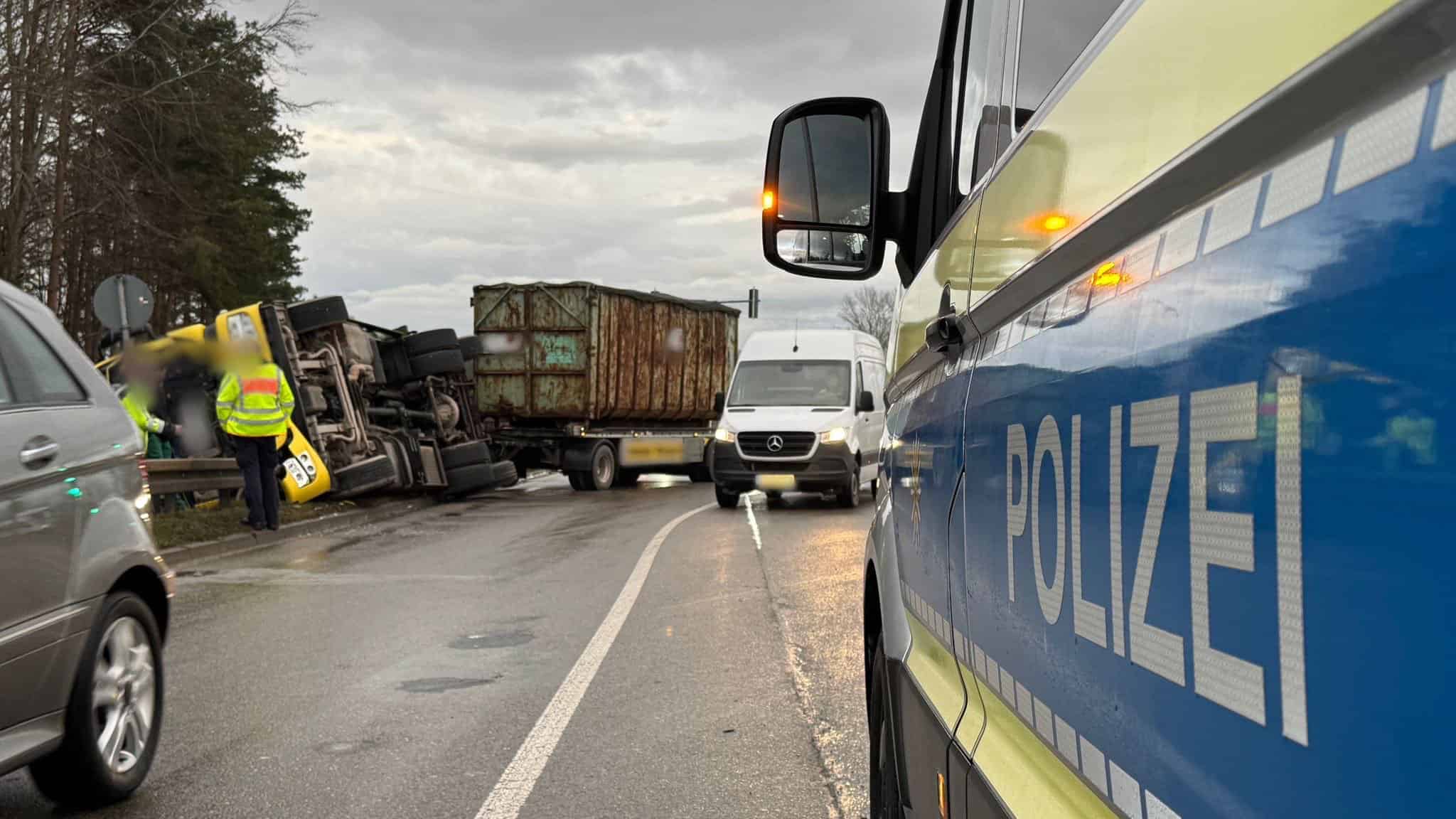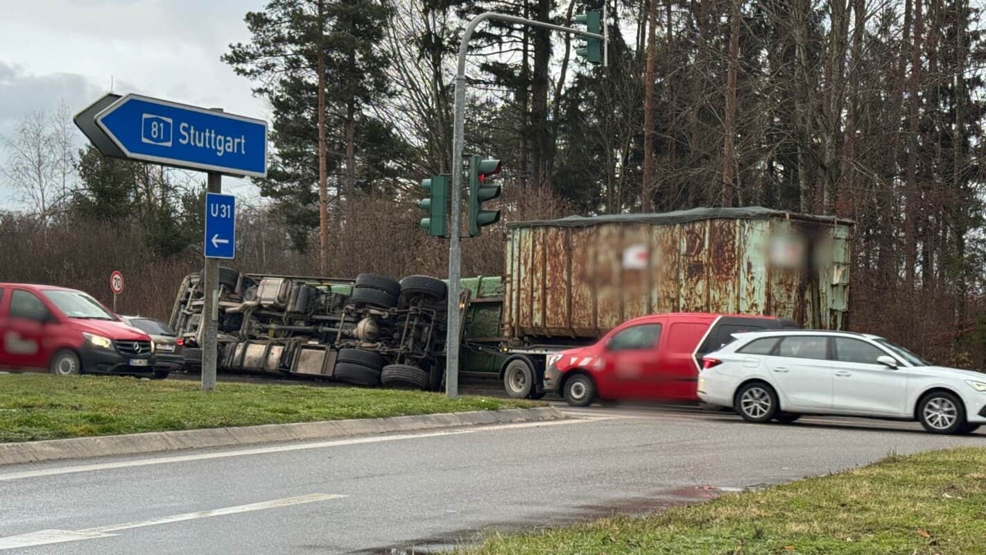 Er war wohl beim Abbiegen zu schnell, vermutet die Polizei: Am Montagmorgen ist ein Lkw auf der B 462 zwischen Rottweil und Dunningen umgekippt. Der Fahrer blieb nach ersten Informationen glücklicherweise unverletzt.