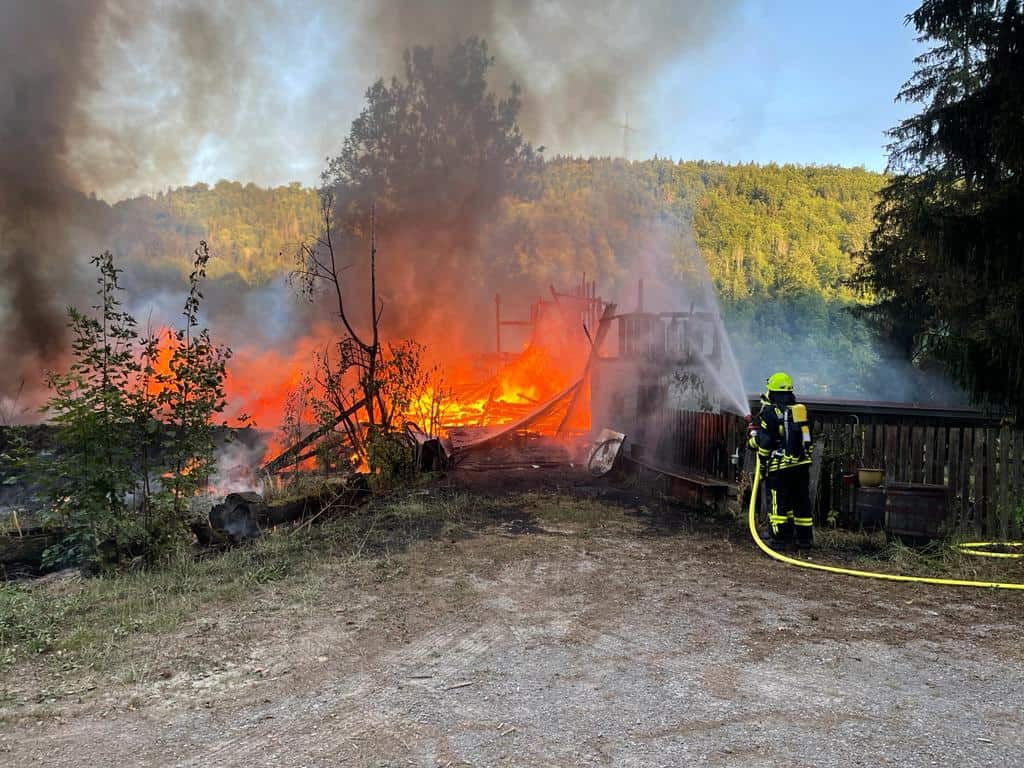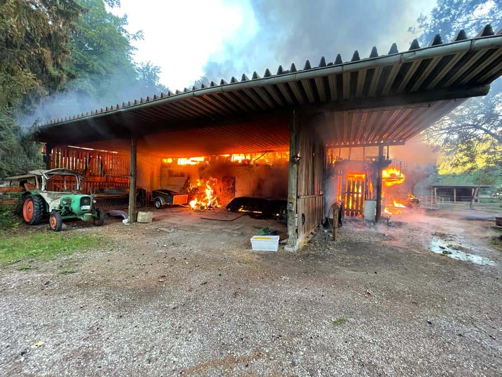 Der Betriebshof eines Landschaftspflegers ist am Morgen bei Sulz komplett ausgebrannt. Menschen und Tiere kamen nicht zu Schaden. Der Hof selbst aber wurde ein Raub der Flammen. Die Feuerwehr konnte ein Übergreifen der Flammen auf den nahen Wald verhindern. Den entstandenen Sachschaden schätzt die Polizei auf rund 300.000 Euro. Die Brandursache ist noch unklar, Hinweise auf fahrlässiges oder vorsätzliches Handeln liegen bislang jedoch laut Polizei nicht vor. Die kriminaltechnischen Untersuchungen dauern an.