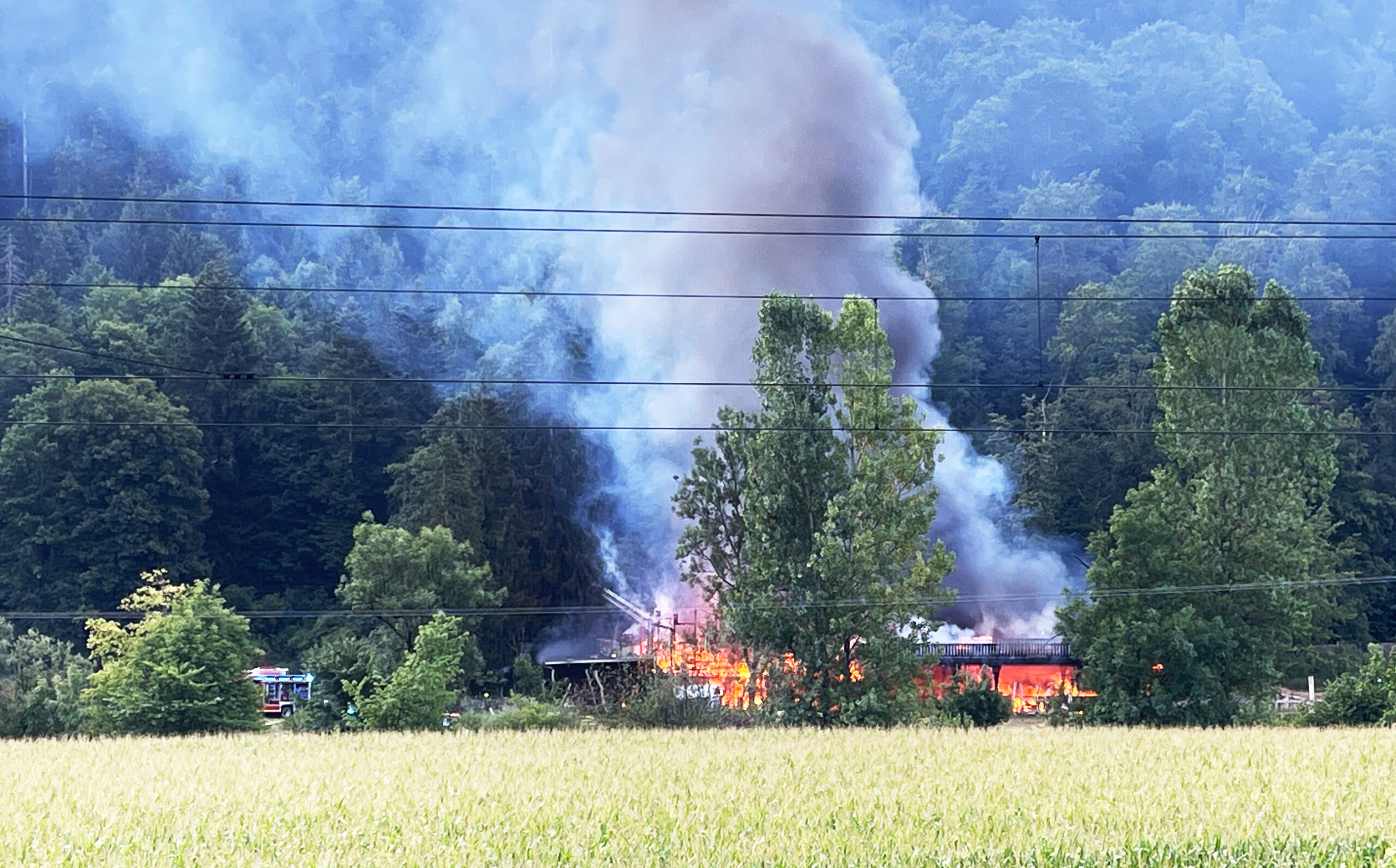 Die gute Nachricht: Menschen und Tiere befanden sich nicht mehr darin. Die beiden Pferde, die in dem Stall untergebracht sind, standen auf der Weide. Ebenso Schafe und Ziegen.