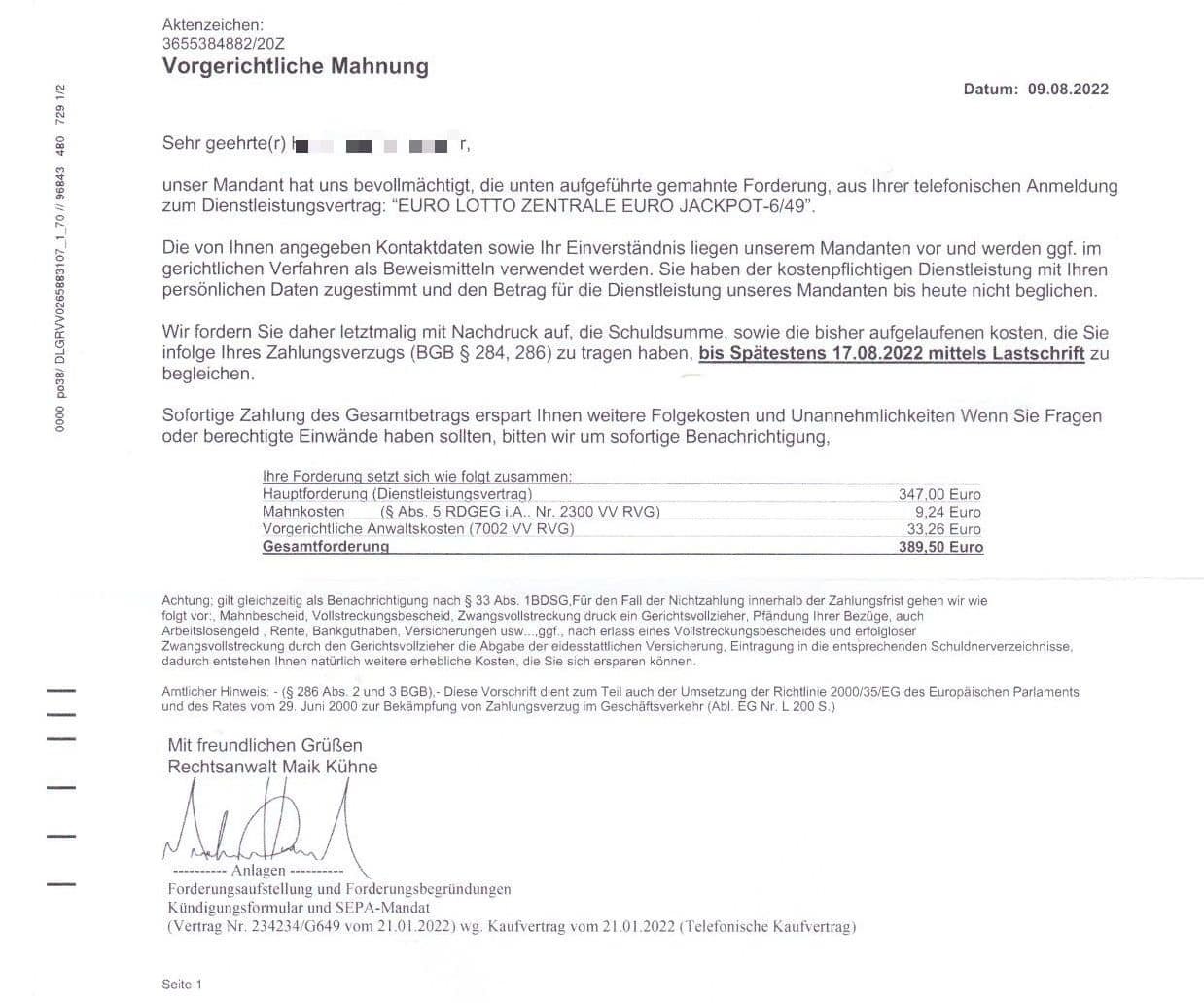 Der Ehemann der heute 90-jährigen Dame soll per Telefon einen Dienstleistungsvertrag mit der „Euro-Lotto-Zentrale Euro Jackpot -6/49“ geschlossen haben und trotz mehrfacher Aufforderung die fälligen 347 Euro nicht bezahlt haben.
