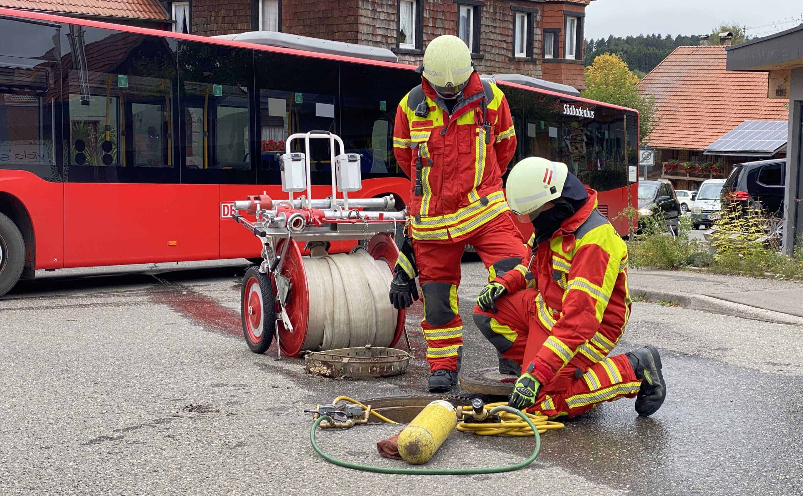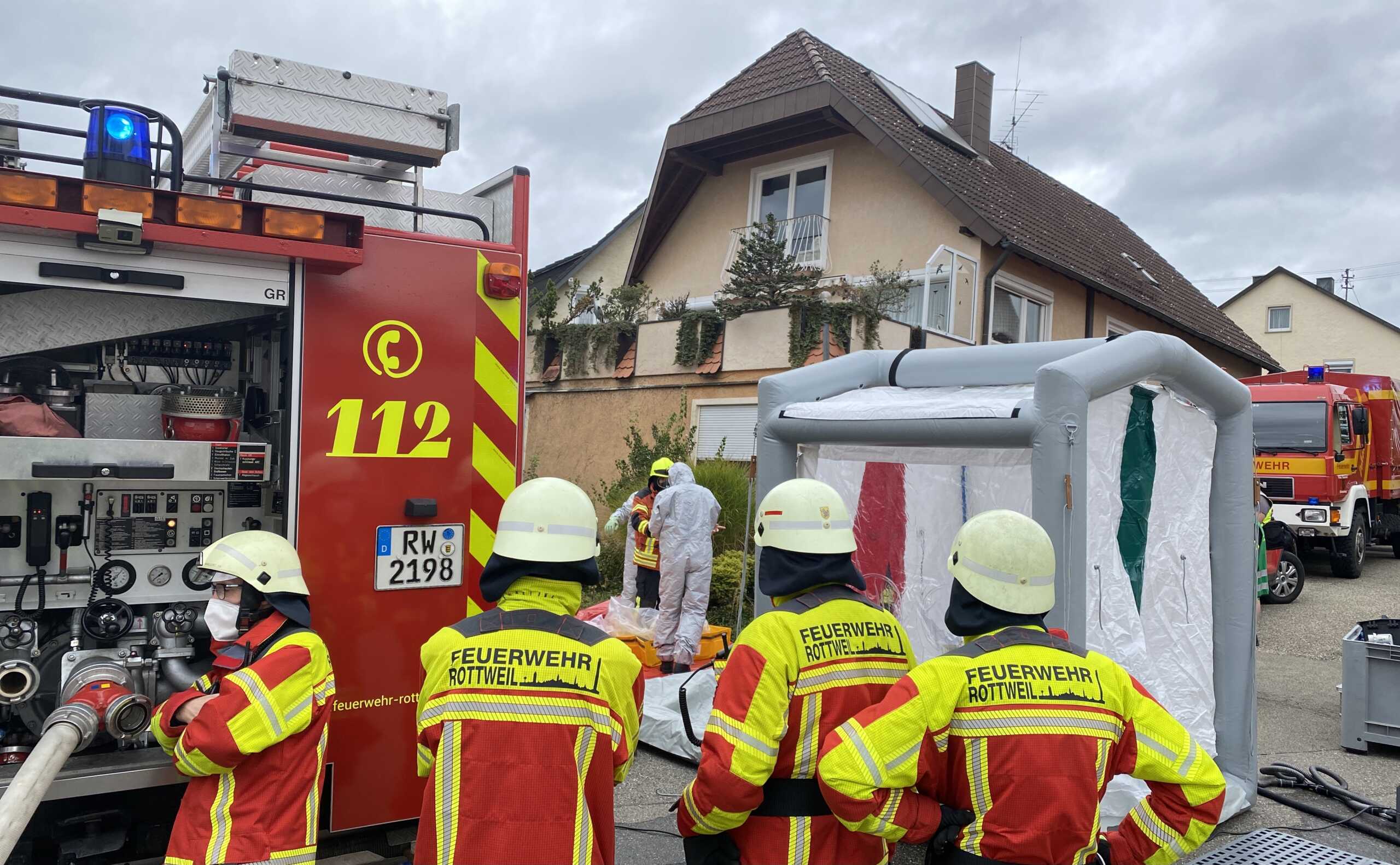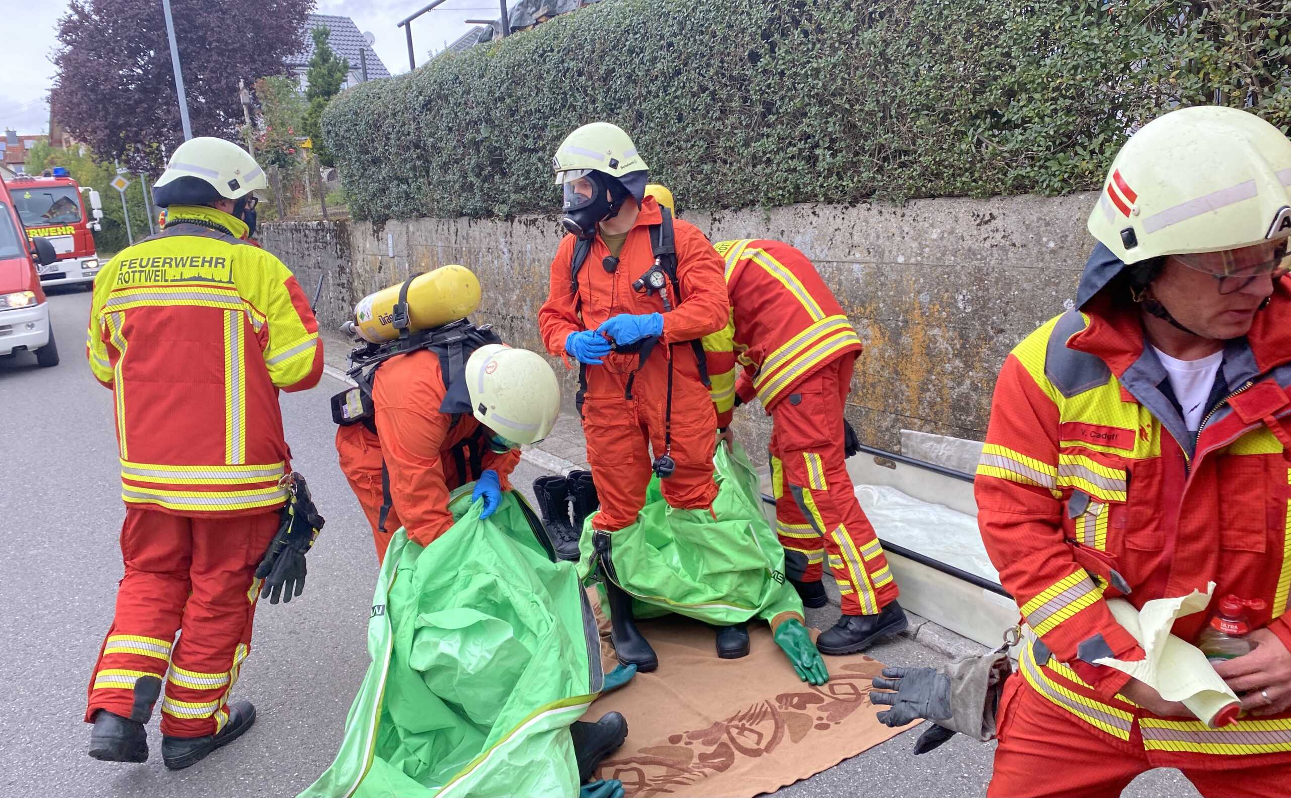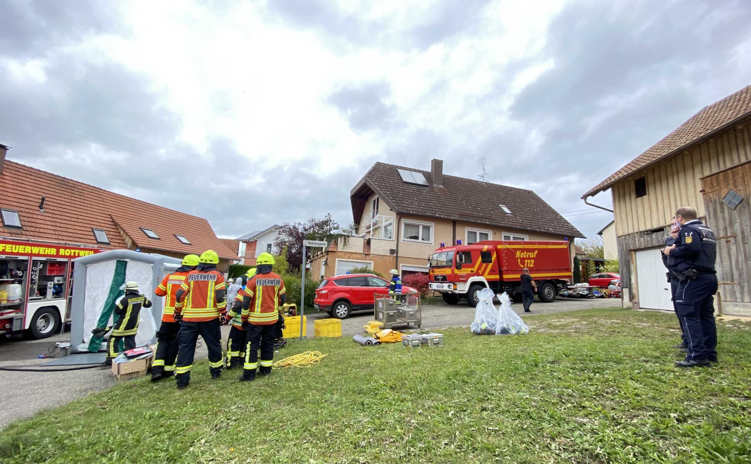 Die Mohrengasse in Dunningen, in der der Betrieb seinen Sitz hat, sowie die Locherhofer Straße wurden gesperrt, die Einsatzstelle mit Flatterband abgeriegelt. Vor Ort war neben der Dunninger Wehr auch der Gefahrgutzug des Landkreises, der in Rottweil stationiert ist. Zusätzlich ist die zentrale Feuerwehrwerkstatt aus Schramberg-Sulgen alarmiert worden. Volker Hils, Gesamtkommandant der Dunninger Wehr, hatte die Einsatzleitung. Kreisbrandmeister Nicos Laetsch machte sich ein Bild von den Einsatzarbeiten.