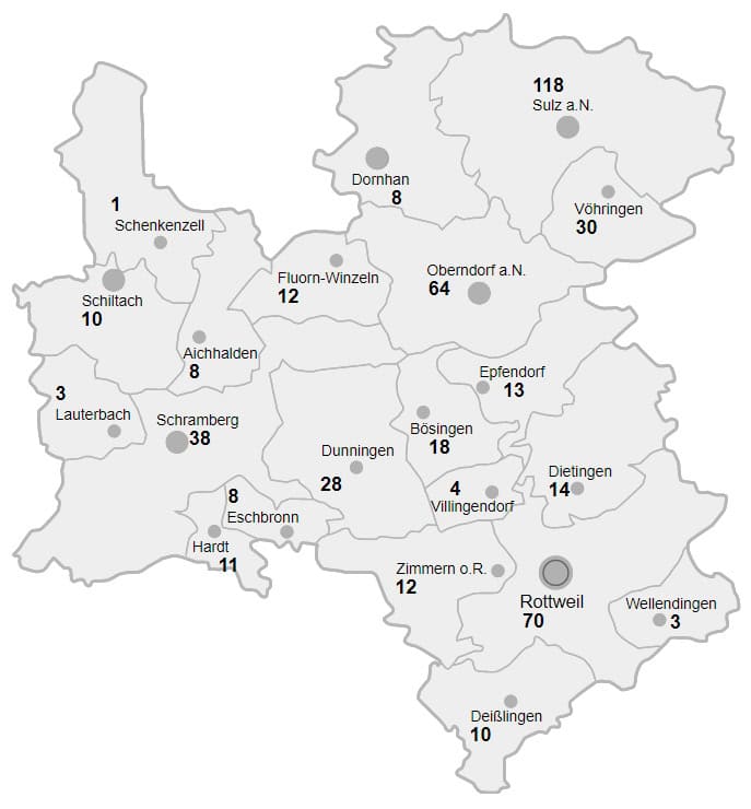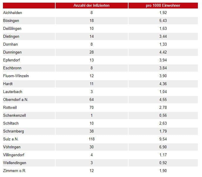 Wie die Landkreis-Übersicht der Covid-19-Infektionen zeigt, bleibt es beim bisherigen – im kreisweiten Vergleich hohen – Niveau an Infektionen im Raum Sulz. Rund 9,5 von 1000 Einwohnern sind dort erkrankt, in Rottweil sind es keine drei.