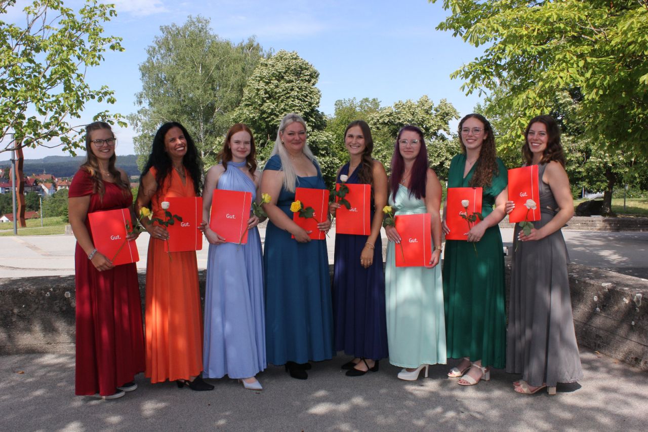 Der krönende Abschluss der Feier folgte durch die Zeugnisvergabe durch Abteilungsleiterin Erika Gruber und Klassenlehrerin Susanne Steger. Abteilungsleiterin Erika Gruber stellte dabei die starken Leistungen im fachlichen und sozialen Bereich der Schülerinnen hervor. Fünf Preise und zwei Belobigungen in einer Klasse von acht Schülerinnen sei eine sehr starke Quote. Eine Diashow mit gesammelten Fotos aus dem Unterricht und Ausflügen aus den drei Jahren und ein leckeres Buffet mit Fingerfood rundete die märchenhafte Abschlussfeier ab.