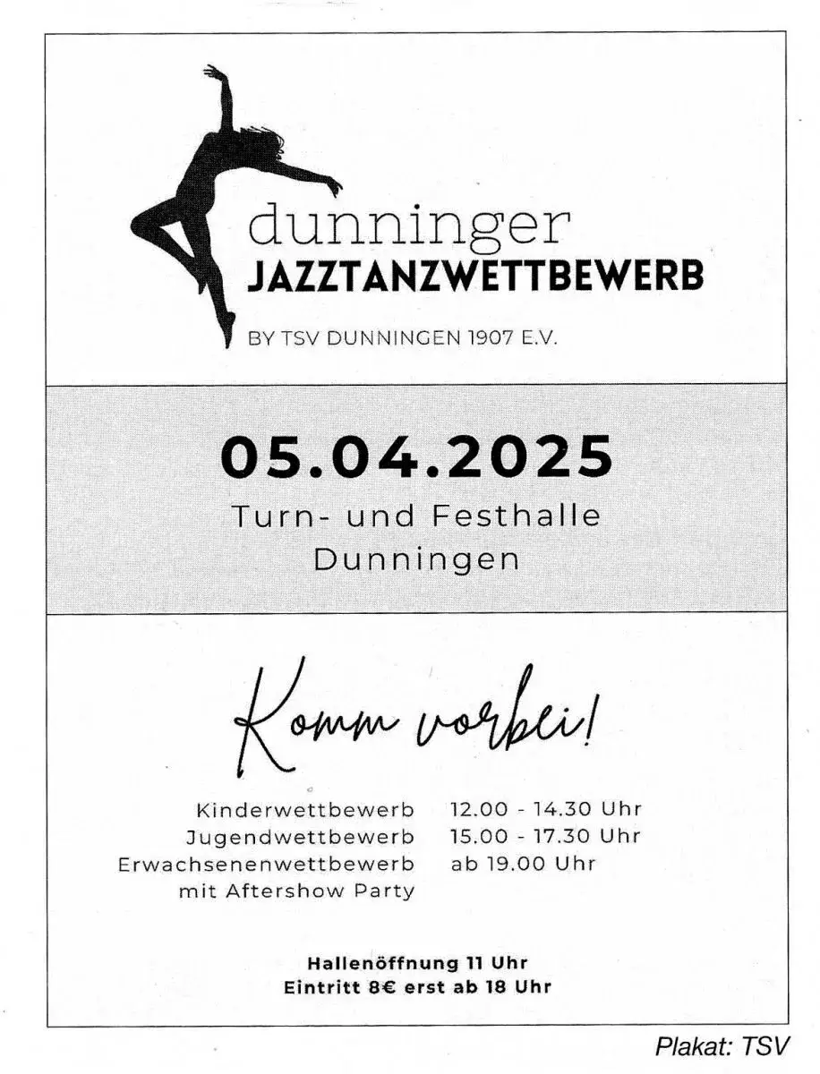 Der erste Dunninger Jazztanzwettbewerb am 5. April 2025 war ein voller Erfolg. Mit 23 teilnehmenden Teams in drei Kategorien war die Dunninger Festhalle über den ganzen Tag hinweg gut gefüllt. Unser Fotograf Fritz Rudolf war dabei, wir bringen seine schönsten Fotos in einer Bildergalerie.