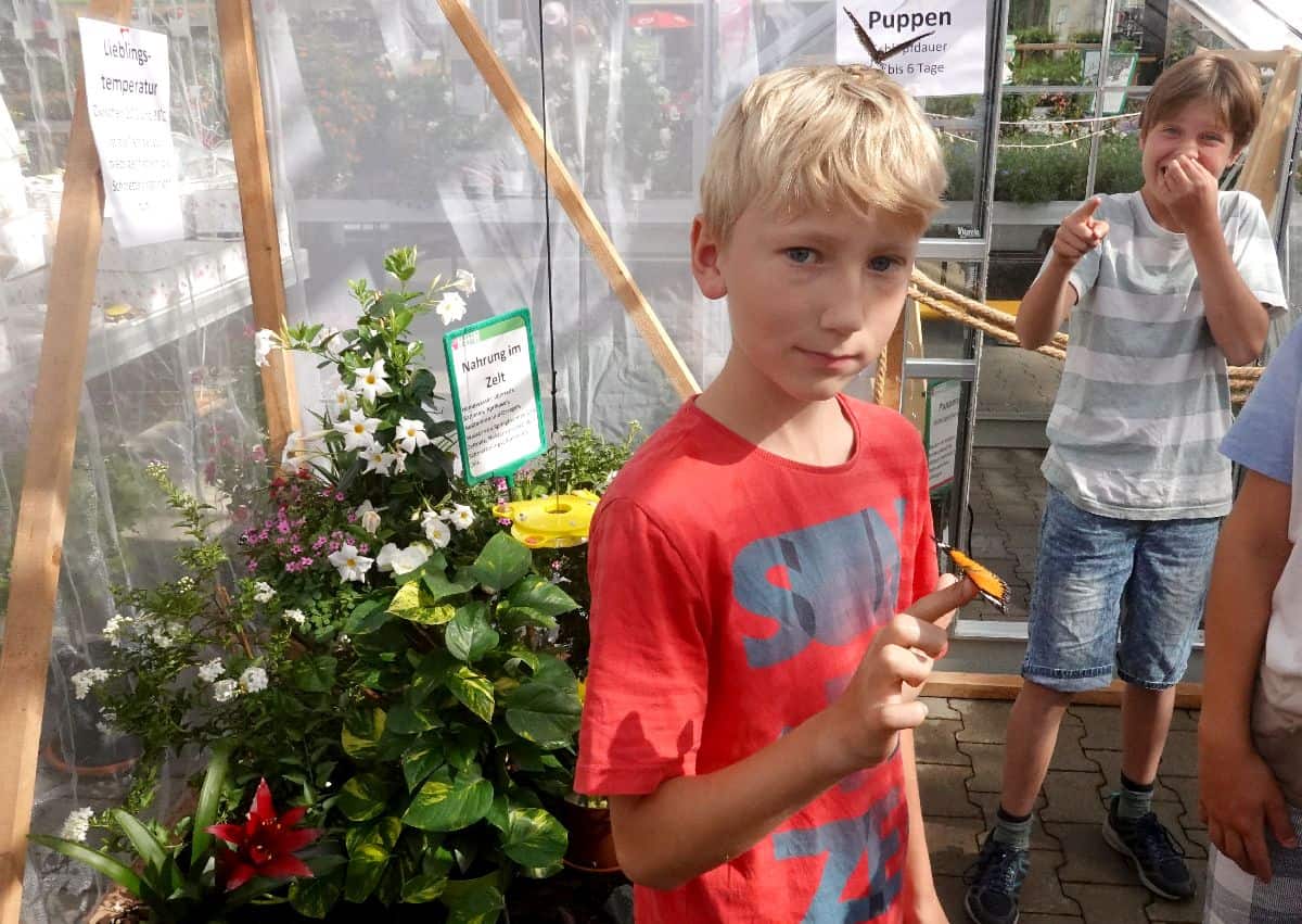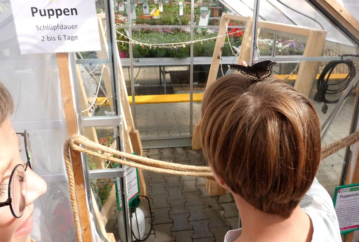 Aber auch zahlreiche Schmetterlingspuppen in verschieden fortgeschrittenen Reifestadien können in einer „Puppenstube“ in Augenschein genommen werden. Täglich schlüpfen Schmetterlinge im tropisch bepflanzen Flugzelt. Wer Glück hat, kann sogar die „Geburt“ eines Falters direkt miterleben und die ersten Minuten in seinem Leben mitverfolgen. Ihre Lebensdauer beträgt zwischen 3 und 20 Tagen.
