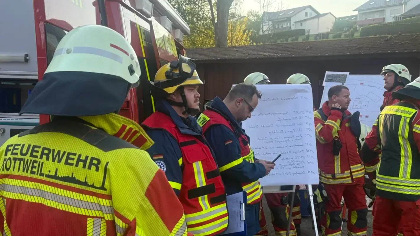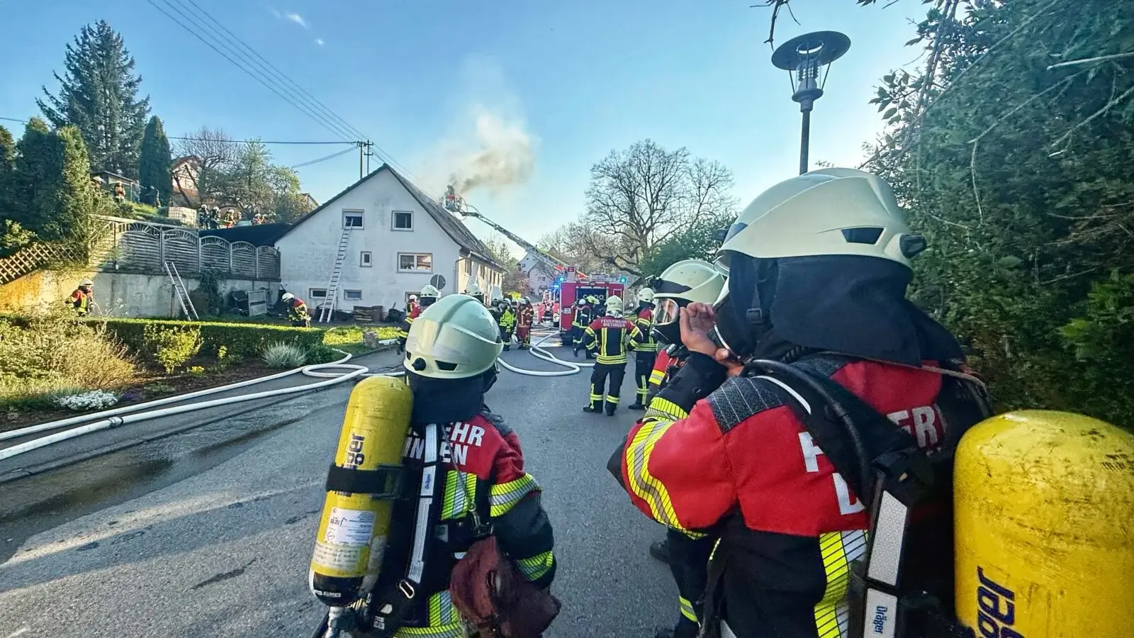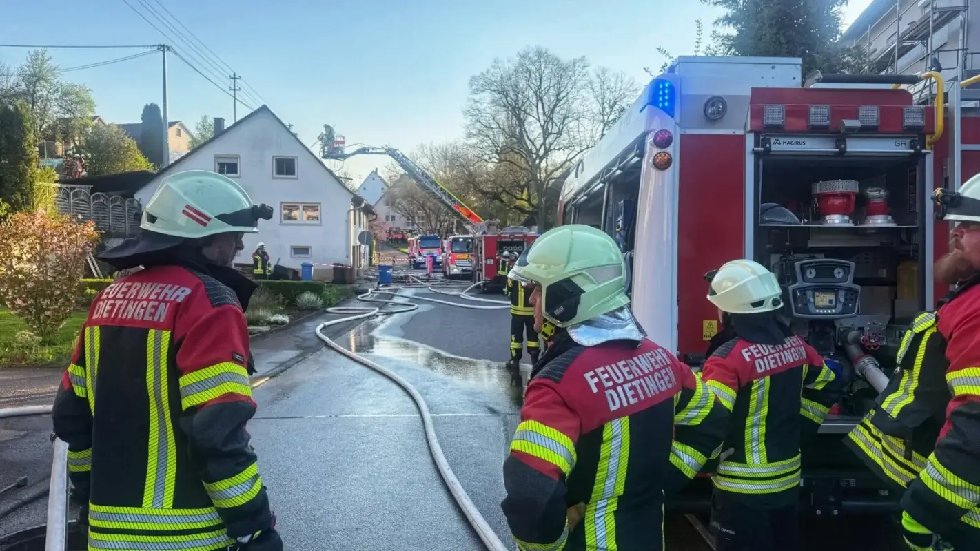 Eine erfahrene Feuerwehrkraft lobte die Wehr vor Ort: „Die haben klasse, hammerschnell reagiert. Die haben das superschnell im Griff gehabt.“ Dietingens Bürgermeister Felix Hezel ist auch an die Einsatzstelle geeilt. Er zeigt sich froh, dass die Feuerwehr vor Ort rasch gehandelt hat. Zudem ist Hauptamtsleiter Matthias Barth da.
