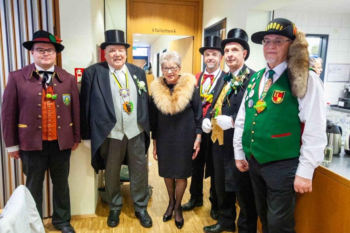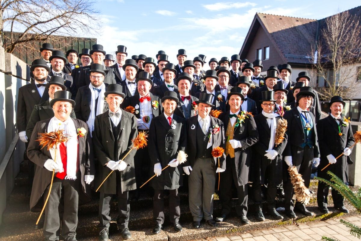 Nach dem obligatorischen Fototermin der Abstauber konnte Zunftmeister Christian Fischinger insgesamt 49 „Men in black“ (Frackträger mit Zylinder) in 21 Touren auf den Weg schicken, um in 104 angemeldeten Häusern die dort vorhandenen Narrenkleidle in einer fest vorgeschriebenen Zeremonie vom Staub eines Jahres zu befreien.