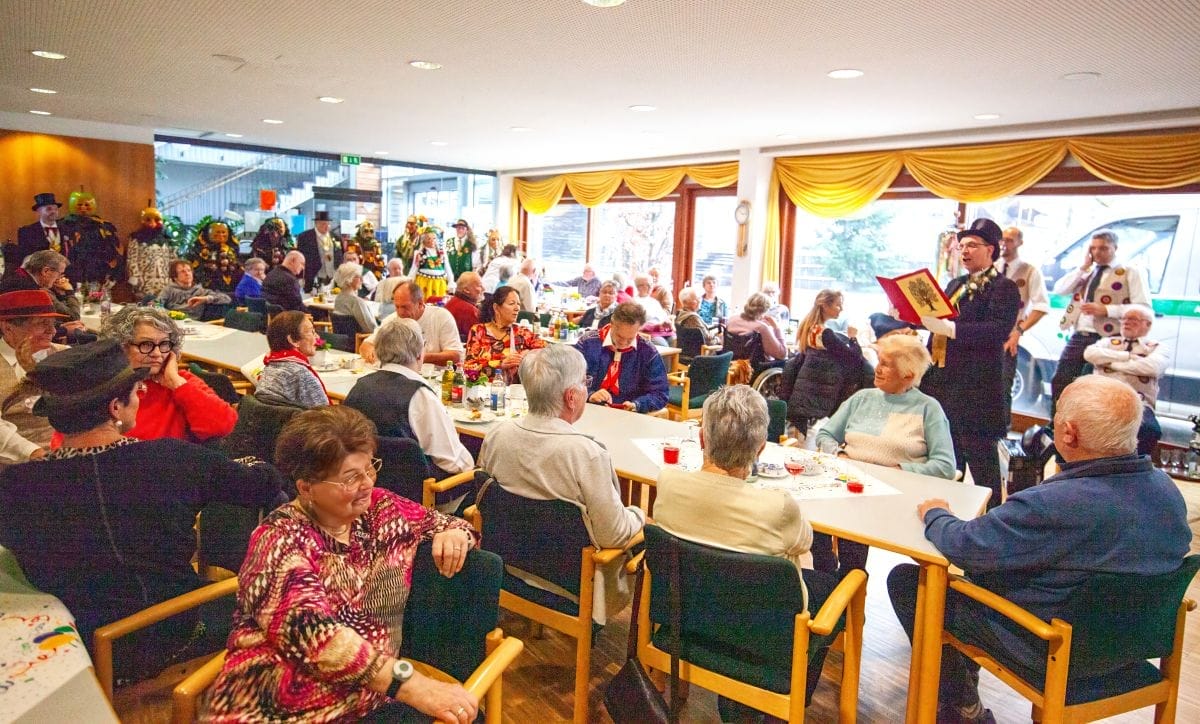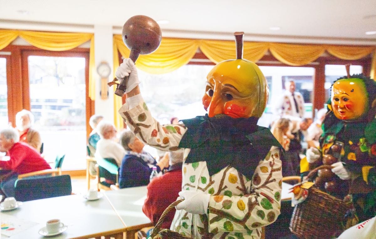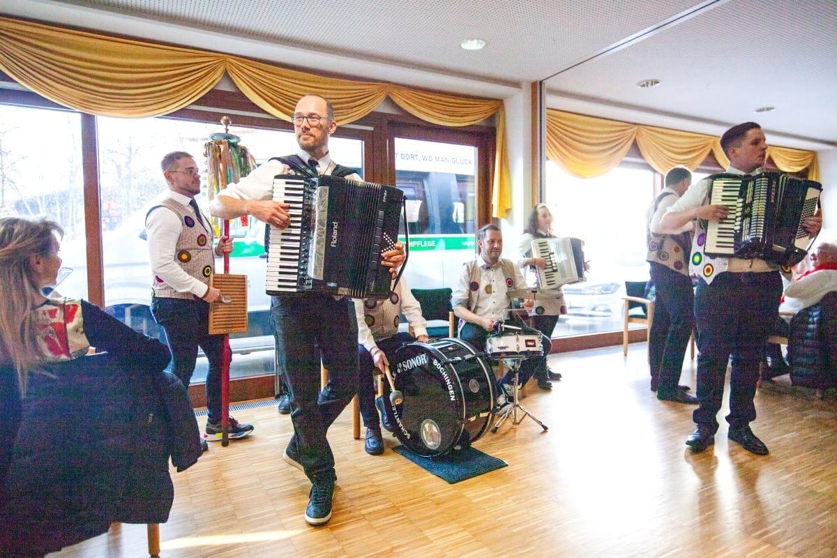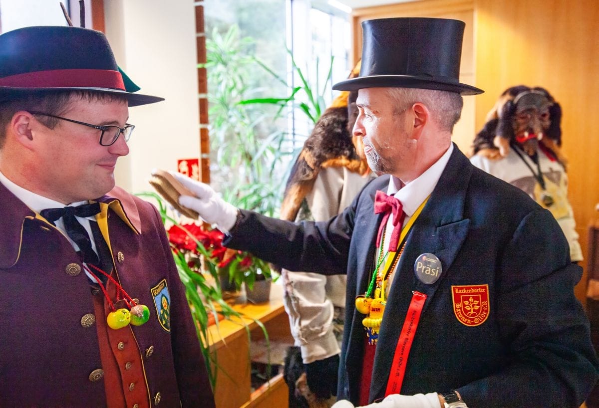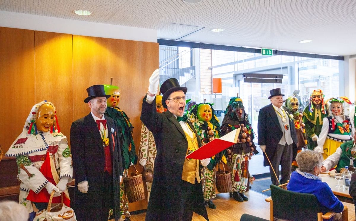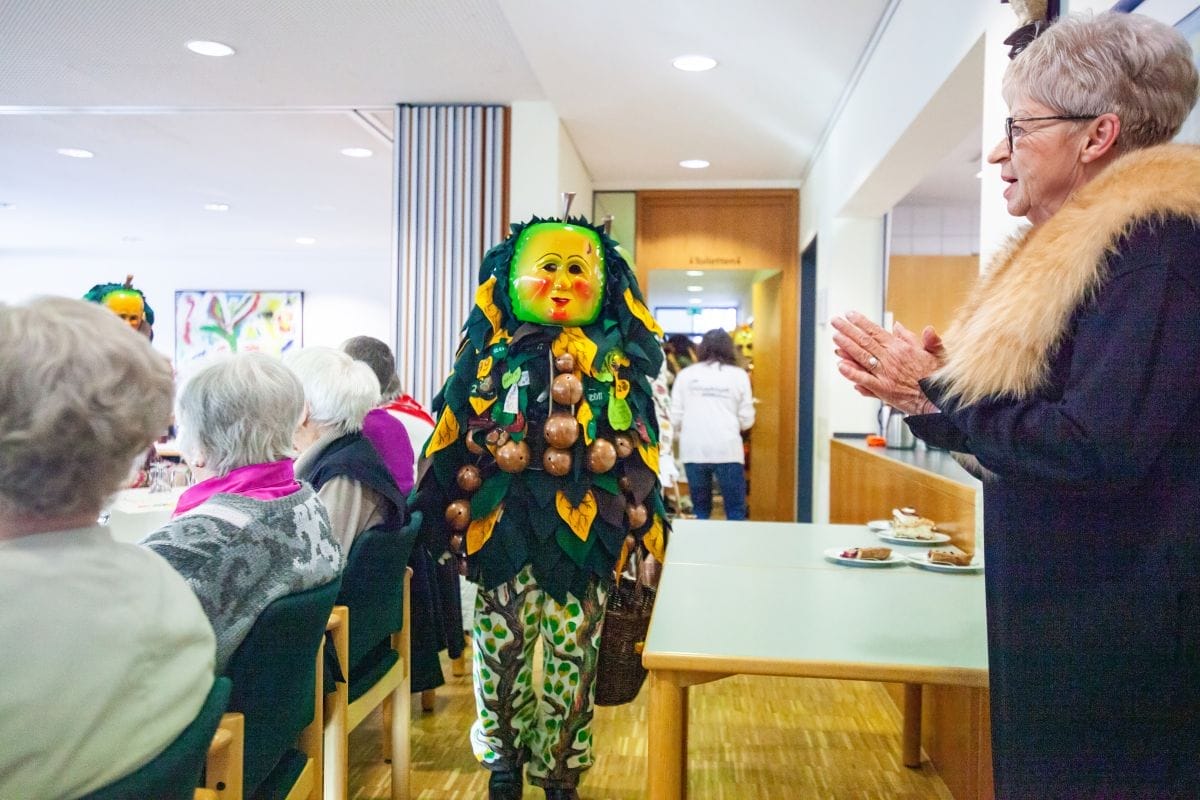 Gespannt warteten auch die Besucher im Haus am Adlerbrunnen auf die Abordnungen der drei Narrenzünfte: Holzäpfel (Dunningen), Raupen (Seedorf) und Baronen (Lackendorf). Einer alten Tradition folgend, erfolgte hier das öffentliche Abstauben für die gesamte Bevölkerung. Die Narren zogen durch die Reihen und suchten den direkten Kontakt, zumeist mit den älteren Hausbewohnern, aber auch den Gästen.