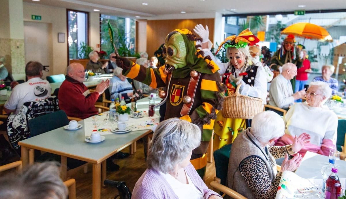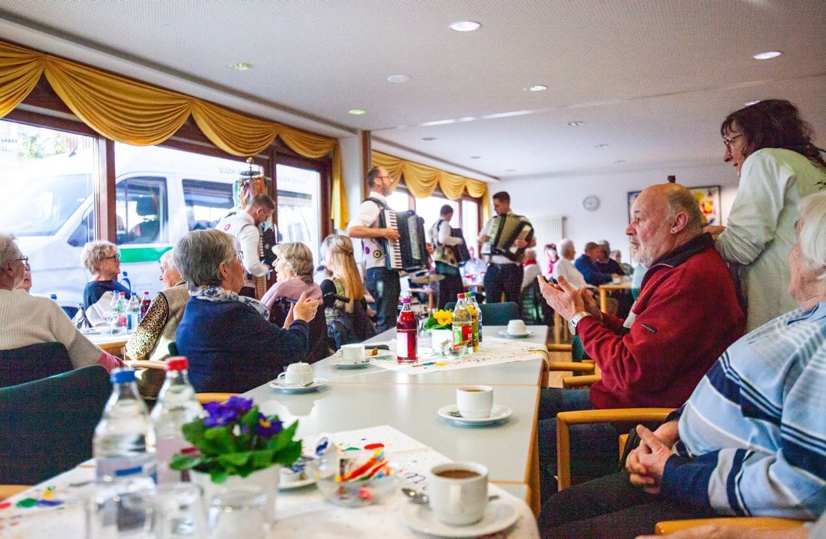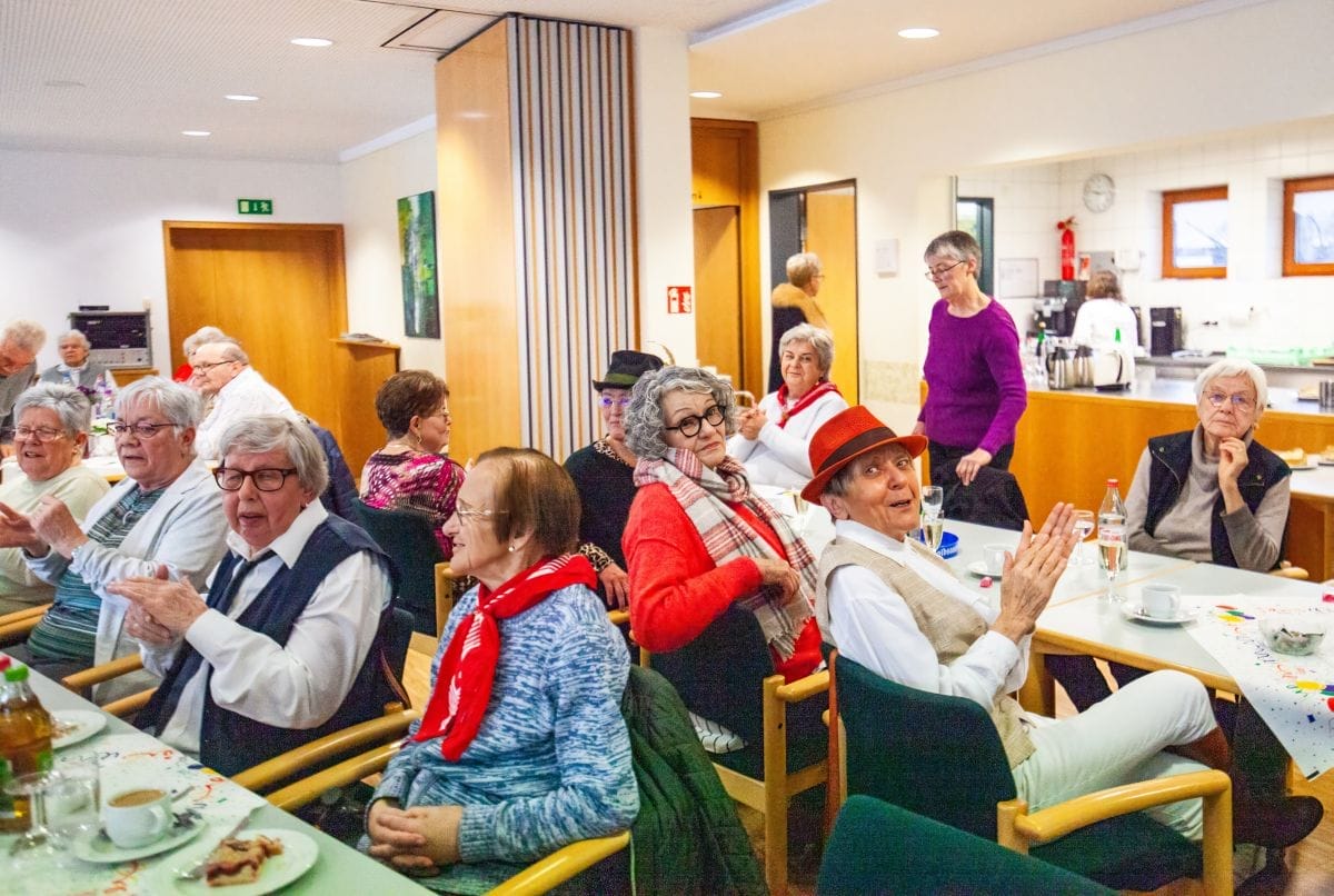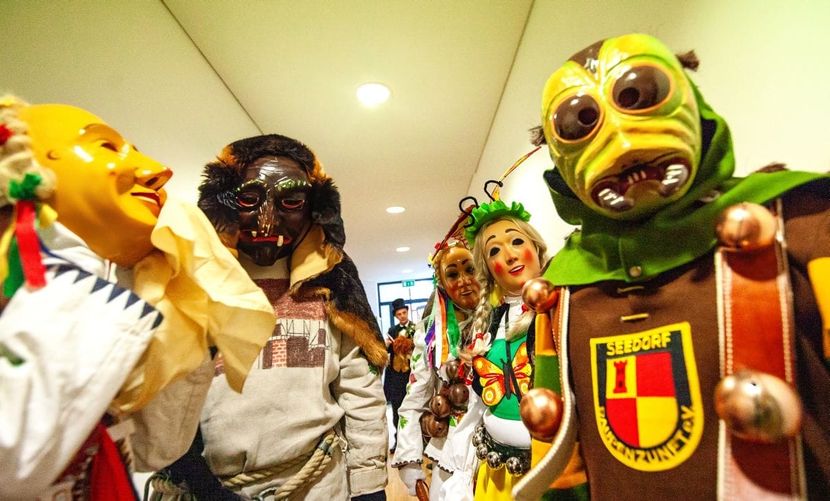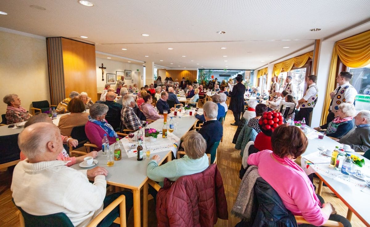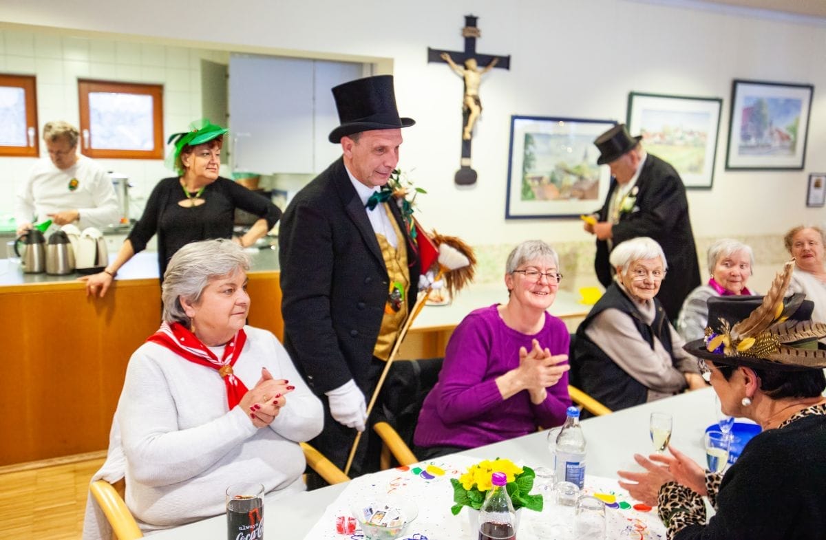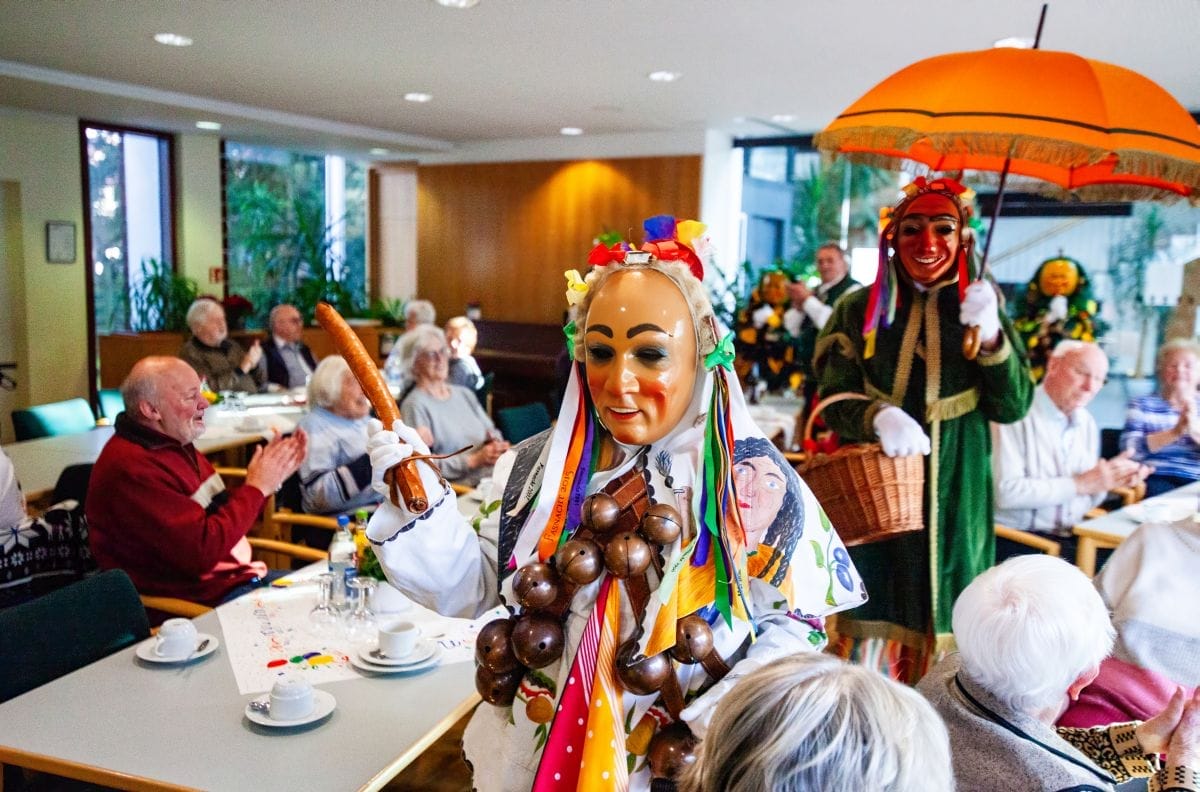Gespannt warteten auch die Besucher im Haus am Adlerbrunnen auf die Abordnungen der drei Narrenzünfte: Holzäpfel (Dunningen), Raupen (Seedorf) und Baronen (Lackendorf). Einer alten Tradition folgend, erfolgte hier das öffentliche Abstauben für die gesamte Bevölkerung. Die Narren zogen durch die Reihen und suchten den direkten Kontakt, zumeist mit den älteren Hausbewohnern, aber auch den Gästen.