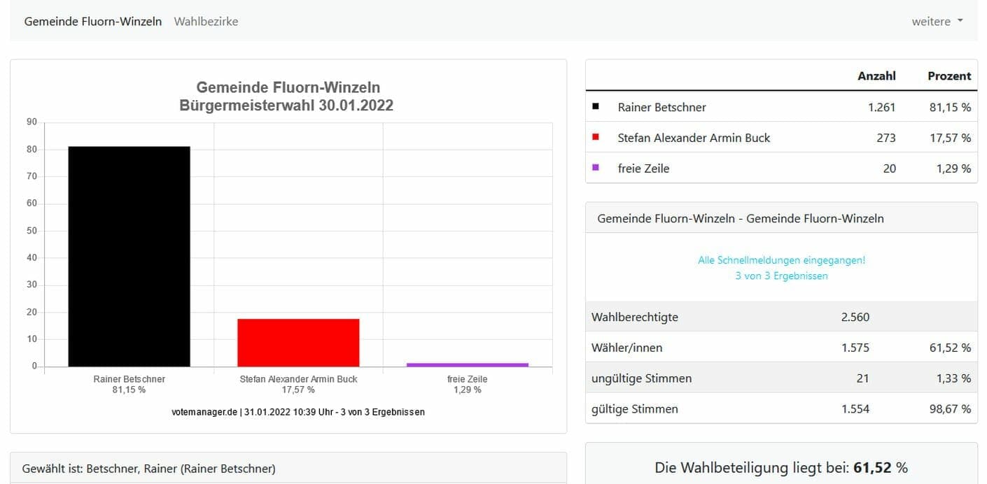 Fluorn-Winzeln. Am Sonntag haben die Bürgerinnen und Bürger von Fluorn-Winzeln mit großer Mehrheit Rainer Betschner zum Bürgermeister gewählt. Der parteilose 37-Jährige erhielt knapp 81 Prozent der abgegebenen Stimmen. Etwa 17,5 Prozent entfielen auf Stefan Buck. Die Wahlbeteiligung lag bei 61,5 Prozent.