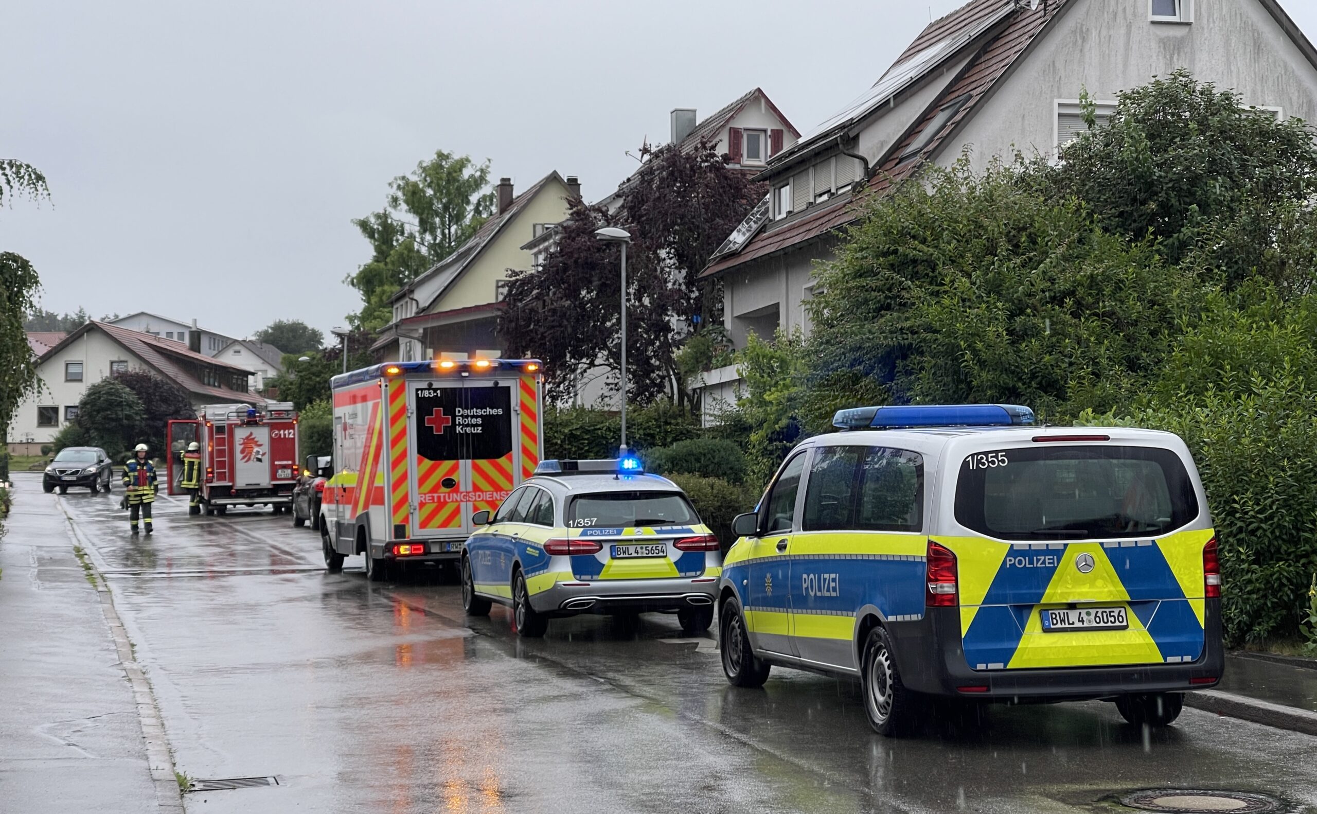 Neben der Feuerwehr eilten auch die Polizei mit zwei Streifenwagen und der Rettungsdienst mit einem Rettungswagen an den Einsatzort in einem Wohngebiet in Villingendorf. Bewohner des Hauses hatten dieses zu diesem Zeitpunkt bereits verlassen, standen mit einem kleinen Kind im Regen. die Besatzung des Rettungswagens kümmert sich um sie.