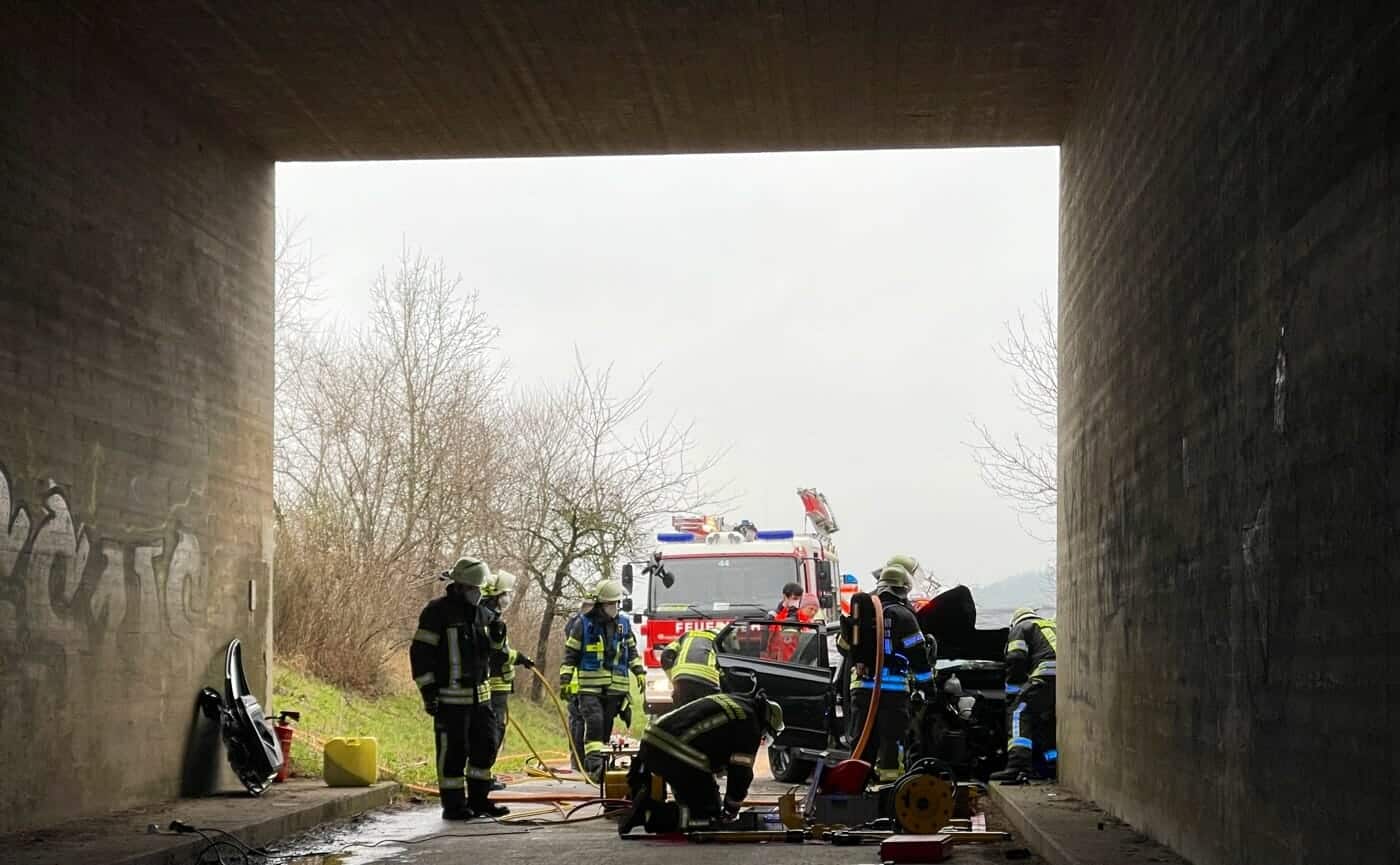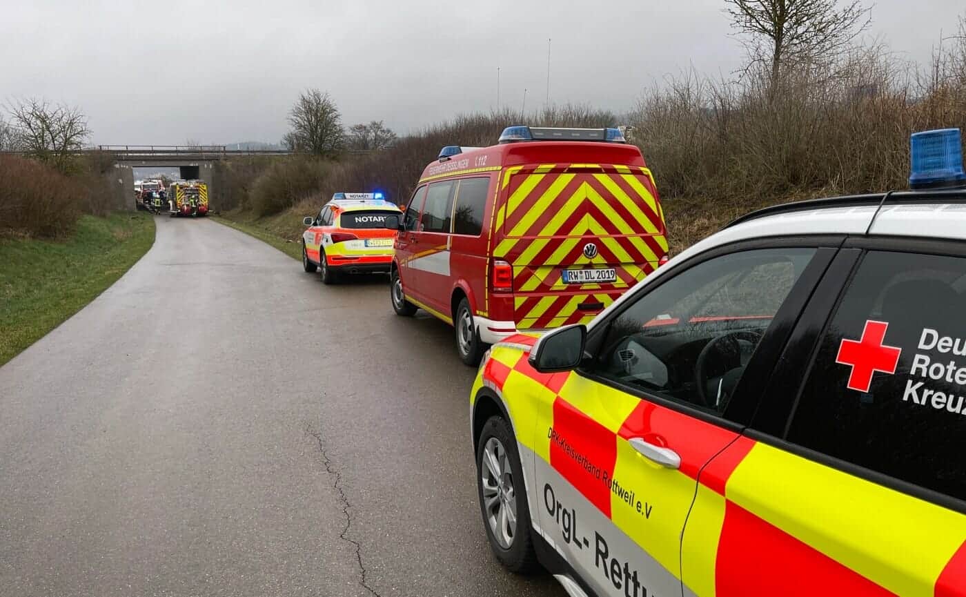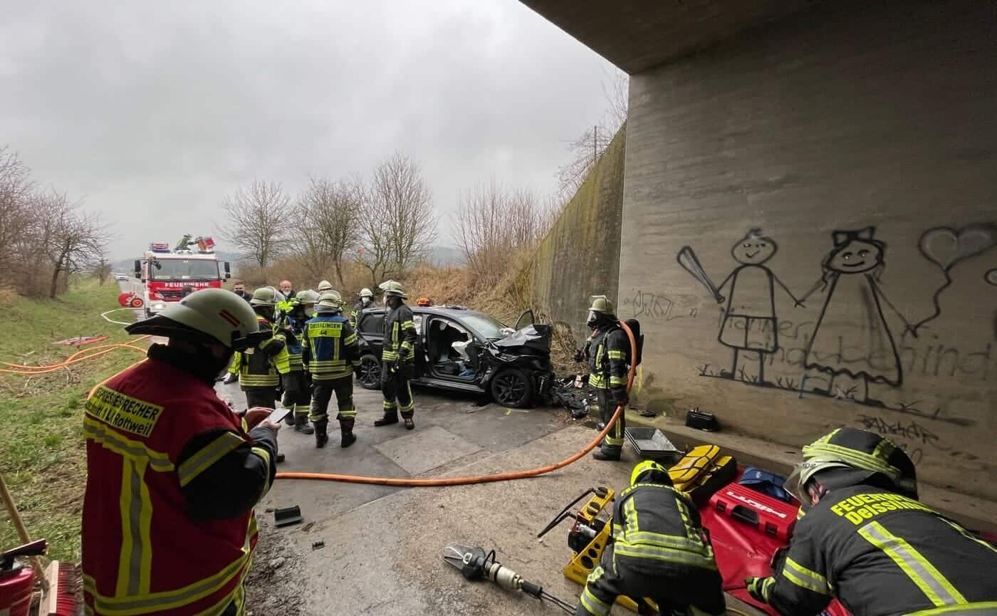 Update, die Polizei berichtet wie folgt: Ein schwerer Unfall hat sich am Freitagmorgen auf dem Gemeindeverbindungsweg zwischen Deißlingen und Dauchingen ereignet. Ein 52 Jahre alter Fahrer eines VW Golf prallte aus noch unbekannten Gründen gegen 8 Uhr frontal auf die Betonwand der Autobahnunterführung. Er wurde in dem neuwertigen Fahrzeug, das an der Front durch den Aufprall erheblich zusammengestaucht wurde, eingeschlossen.
