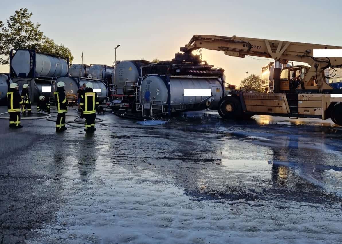 Unser ursprünglicher Bericht: Bei Verladearbeiten in einem Industriegebiet in Böhringen geriet am Dienstag gegen 18 Uhr ein Container an einem mobilen Verladekran aus ungeklärter Ursache plötzlich in Schräglage und stürzte aus mehreren Metern Höhe ungebremst zu Boden. Darüber berichtet der Sprecher der Gesamtfeuerwehr Dietingen, Olaf Lutzkat. „Der mit einer klebrigen Flüssigkeit zur Bearbeitung von Papierprodukten befüllte Silocontainer schlug dabei leck. Es ergossen sich etwa 11.500 Liter einer zähen und klebrigen Flüssigkeit über den Hof der Firma“, so der Dietinger Feuerwehrsprecher.