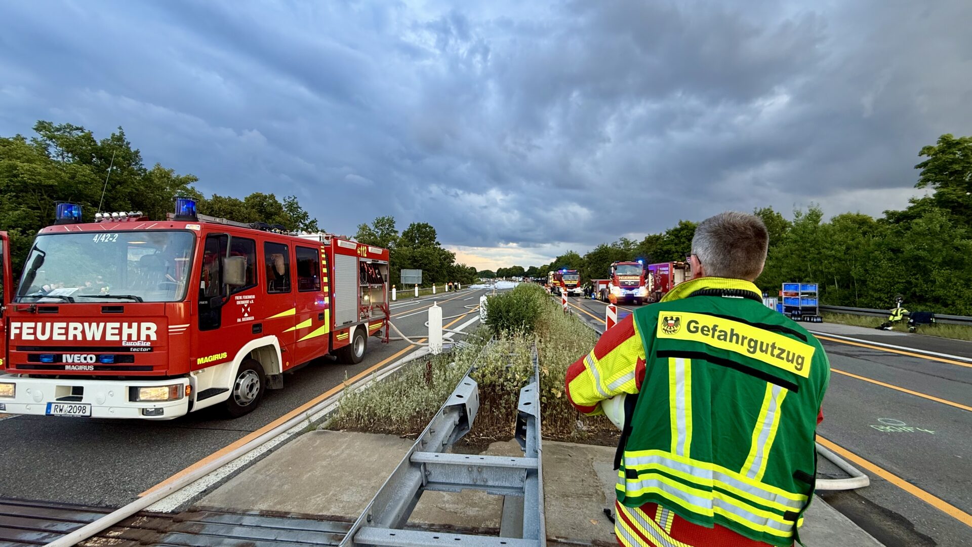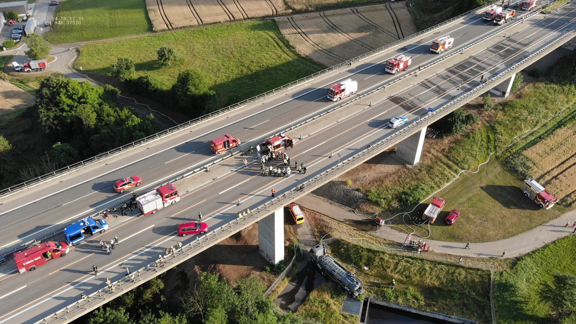 Gestern war es auf der A81 zwischen Sulz und Empfingen zu einem folgenschweren Unfall gekommen: Ein Tanklaster, der eine hochentzündliche Chemikalie geladen hatte, war in einer Baustelle ins Schlingern geraten, umgestürzt und in Brand geraten. Allein aus dem Landkreis Rottweil waren Einsatzkräfte aus Sulz, Bergfelden, Sigmarswangen, Dürrenmettstetten, Mühlheim, Renfrizhausen, Villingendorf, Oberndorf, Rottweil, Göllsdorf, Bochingen und Schramberg-Sulgen an der Unfallstelle. Auch der ABC-Zug sowie die Drohenstaffel des Landkreises waren vor Ort. Am Montagabend wurden außerdem das THW Schramberg und Rottweil alarmiert, um die Unfallstelle auszuleuchten. Insgesamt waren Feuerwehren aus fünf Landkreisen im Einsatz, unterstützt wurde der Einsatz von der Integrierten Leitstelle Rottweil (ILS) und ihrer Feuerwehrunterstützung mit sechs Personen und zweimal Lagediensführer ILS.