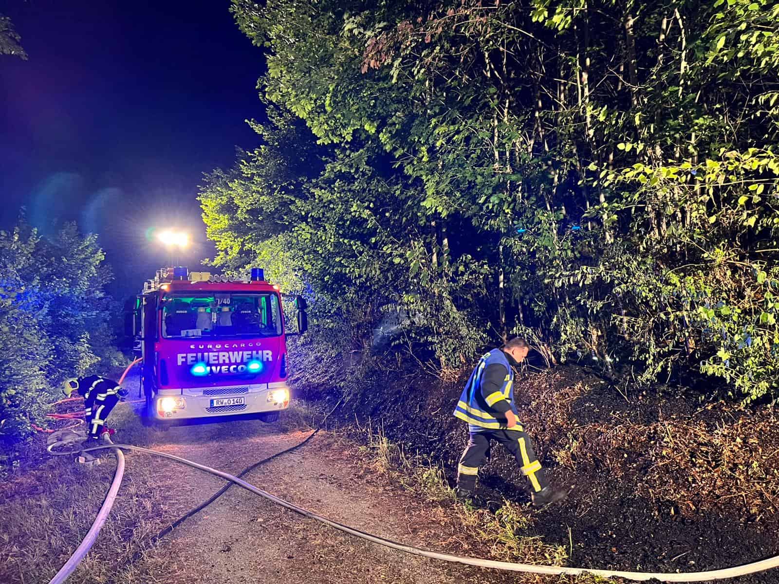 Unser ursprünglicher Bericht: Der erste Alarm für die Feuerwehr kam um 0.27 Uhr in der Nacht auf Donnerstag. Das berichtet der Oberndorfer Feuerwehrkommandant Manuel Suhr auf Nachfrage der NRWZ. Etwa 150 Quadratmeter Fläche nahe der Teckstraße hätten dort gebrannt. Unter anderem mit zwei Tanklöschfahrzeugen und einem sogenannten Großtanker, der allein 5000 Liter Wasser an die Einsatzstelle brachte, rückte die Oberndorfer Wehr an. Mit 8500 Litern Wasser insgesamt. Und mit einem Zangenangriff habe man den Brand „recht schnell in den Griff bekommen“, so Suhr, und schließlich abgelöscht. Gut sei gewesen, dass man die Brandstelle, eine gut erreichbare Böschung, direkt habe anfahren können. Nur die Wasserversorgung ist in solchen Lagen außerhalb der Bebauung ein Problem.