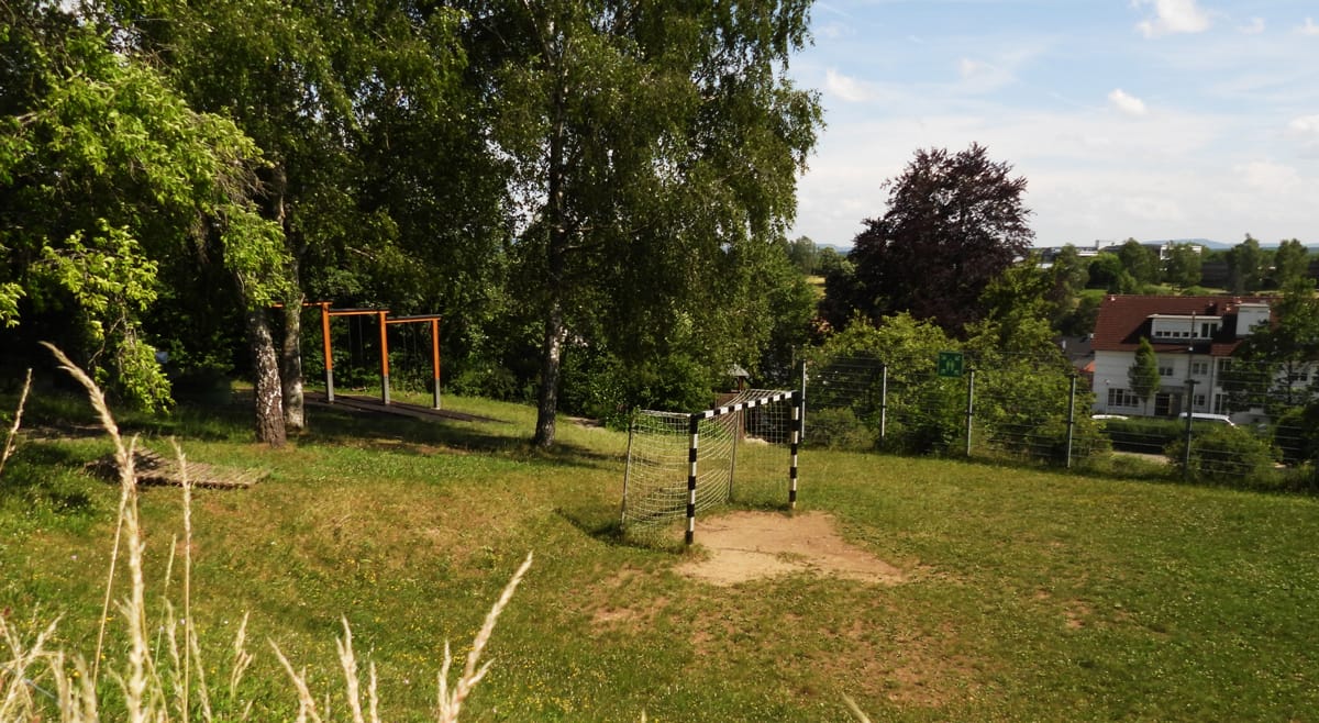 Blick auf den Außenbereich mit Spiel- und Bolzplatz.