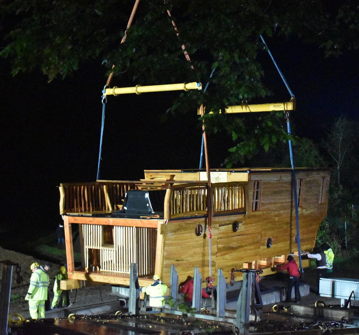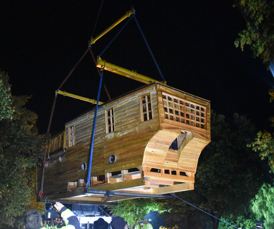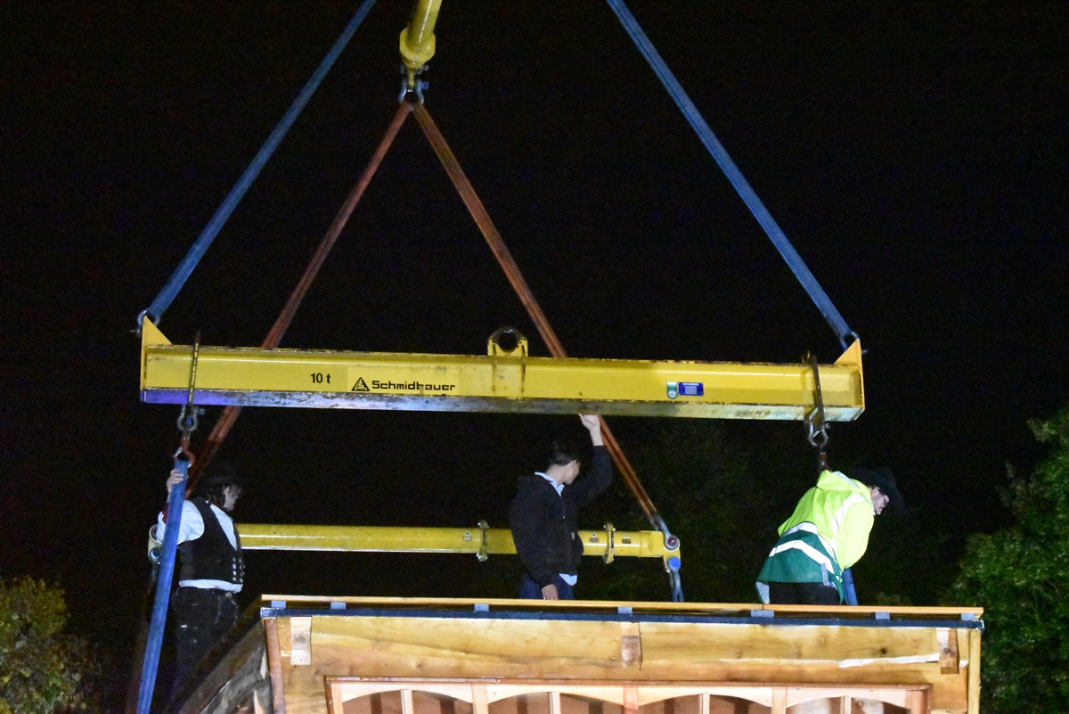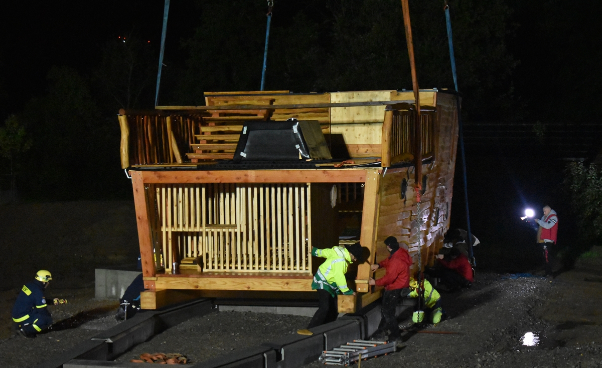 Der Transporter mit seinem Tross erreicht Lauffen. Zwar ist es schon dunkel, aber das THW Rottweil beleuchtet den Ort des Geschehens taghell. Dann die Vorbereitung zum Entladen. Routiniert sind die Männer, die die Bänder befestigen. Und um 21.37 hebt sich tatsächlich der Schiffsteil. Zielsicher bringt der Kranführer das Piratenschiff an den vorbereiteten Platz, seine Kollegen übernehmen die Feinabstimmung. Beifall von den Zuschauern.