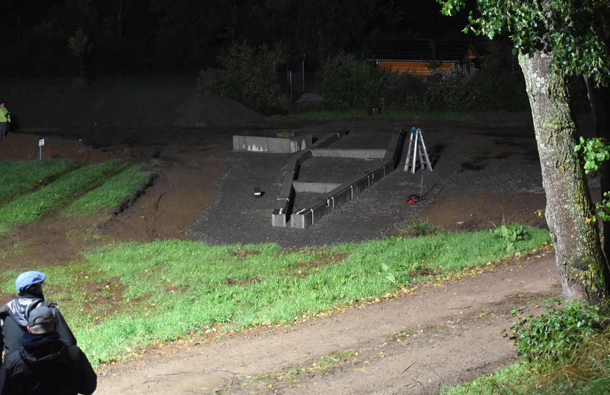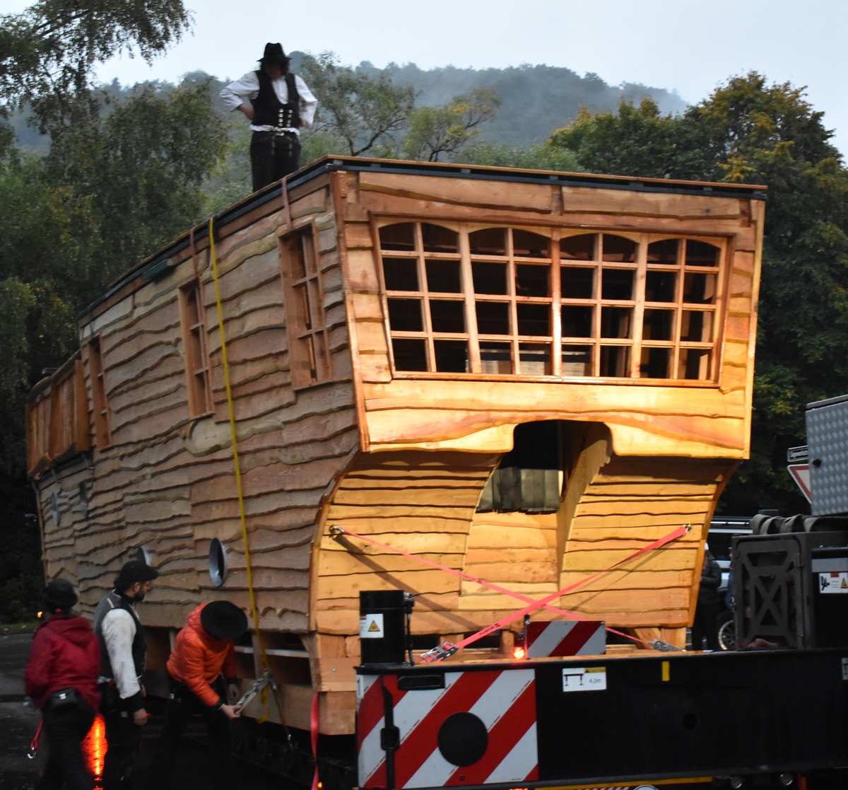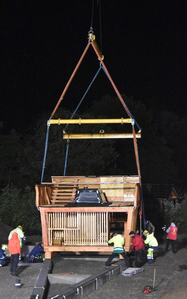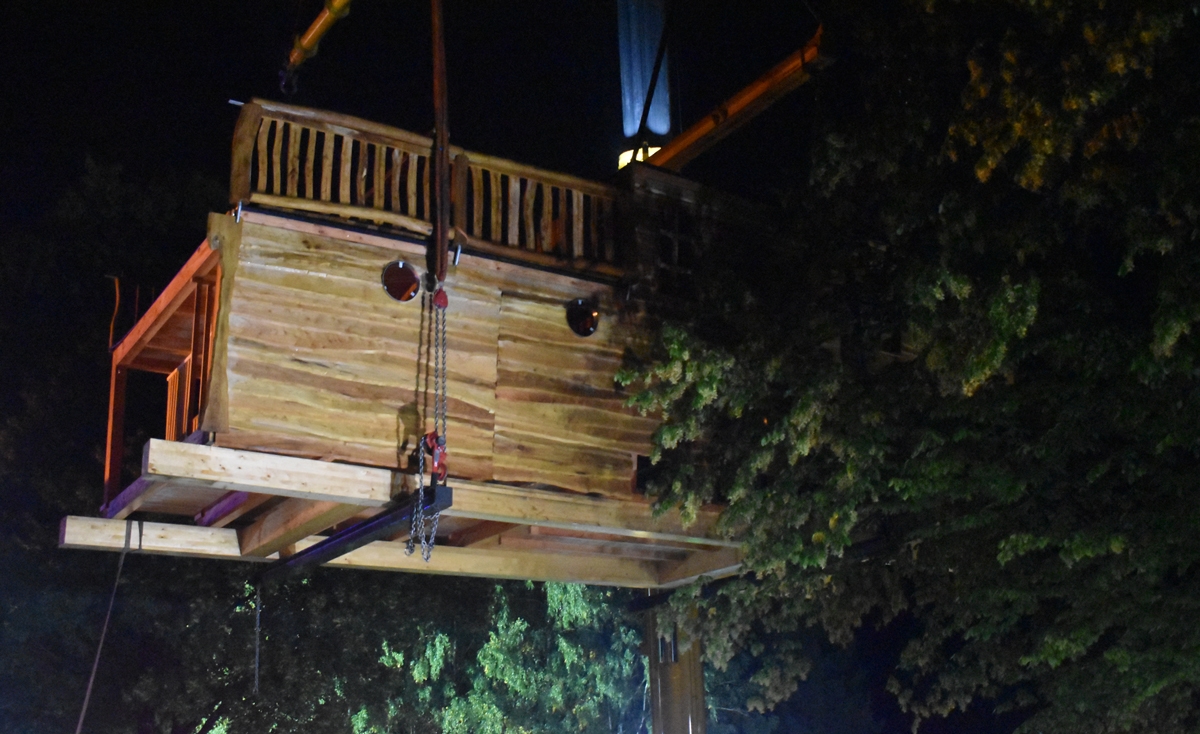 Der Transporter mit seinem Tross erreicht Lauffen. Zwar ist es schon dunkel, aber das THW Rottweil beleuchtet den Ort des Geschehens taghell. Dann die Vorbereitung zum Entladen. Routiniert sind die Männer, die die Bänder befestigen. Und um 21.37 hebt sich tatsächlich der Schiffsteil. Zielsicher bringt der Kranführer das Piratenschiff an den vorbereiteten Platz, seine Kollegen übernehmen die Feinabstimmung. Beifall von den Zuschauern.