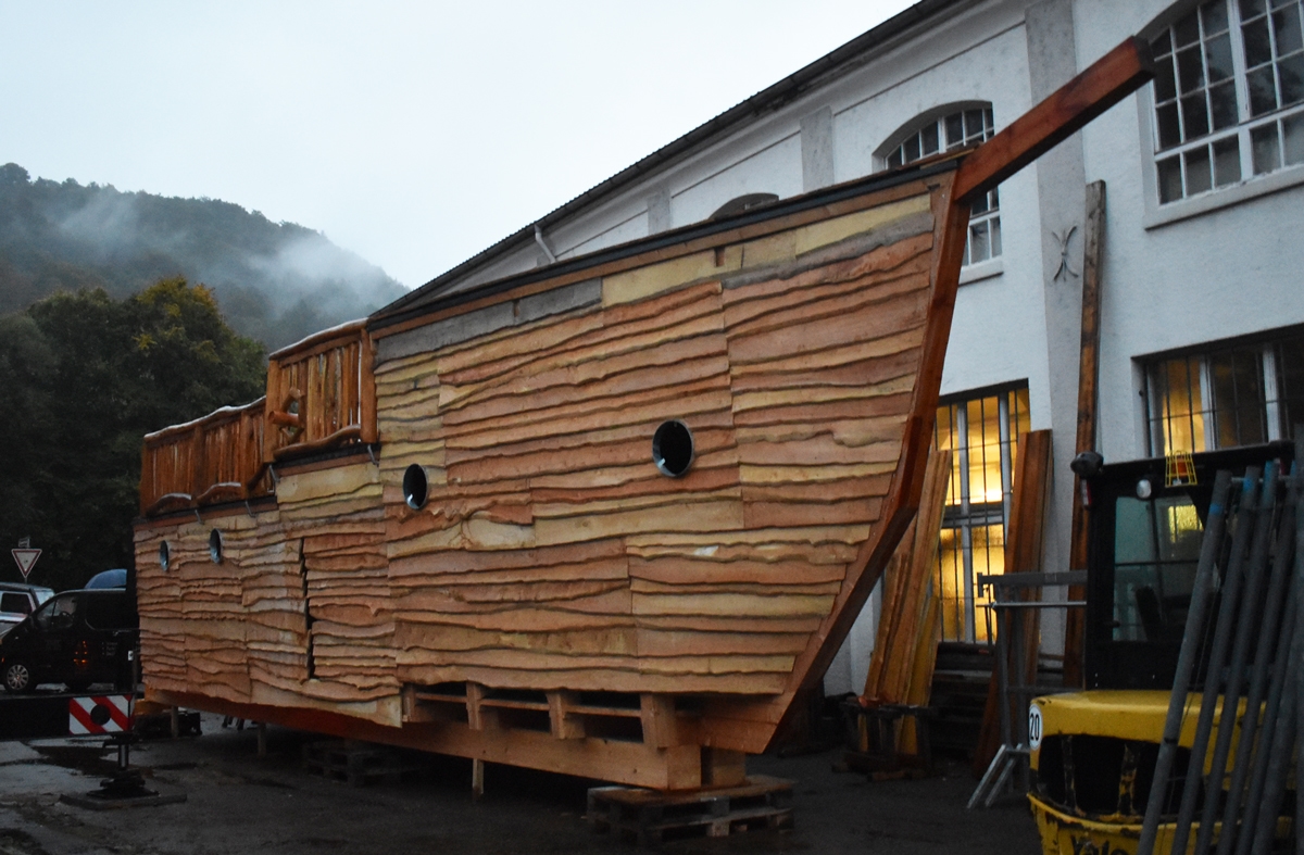 Lauffen – Ein Werk der Zimmermannskunst. Gefertigt wurde es in Oberndorf, 22 Meter lang plus 3,90 für den Bug, 3,50 Meter breit. Nun also der Transport nach Lauffen, in zwei Teilen.