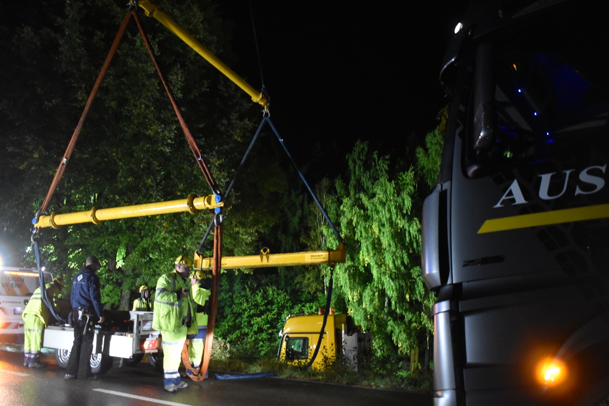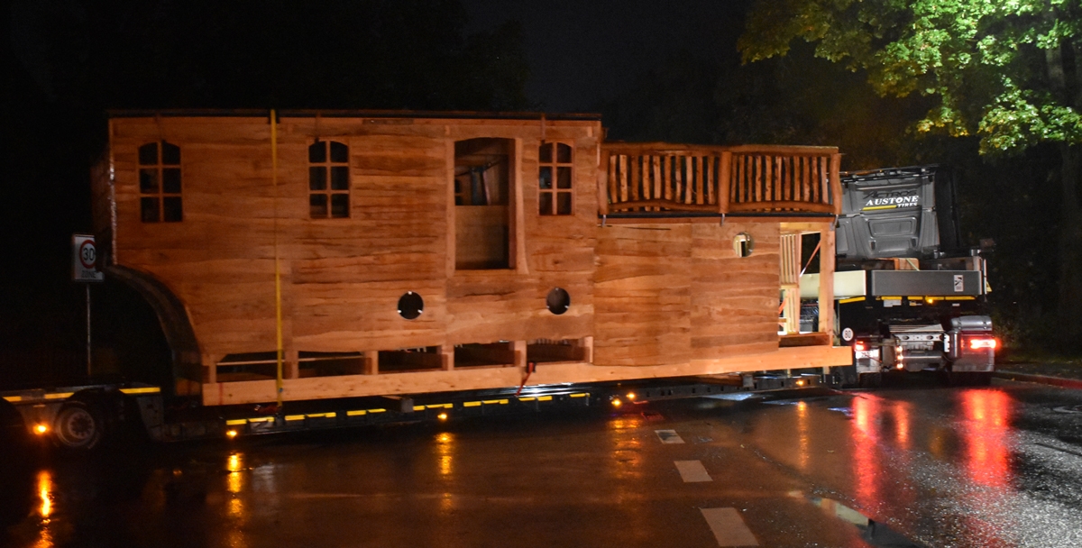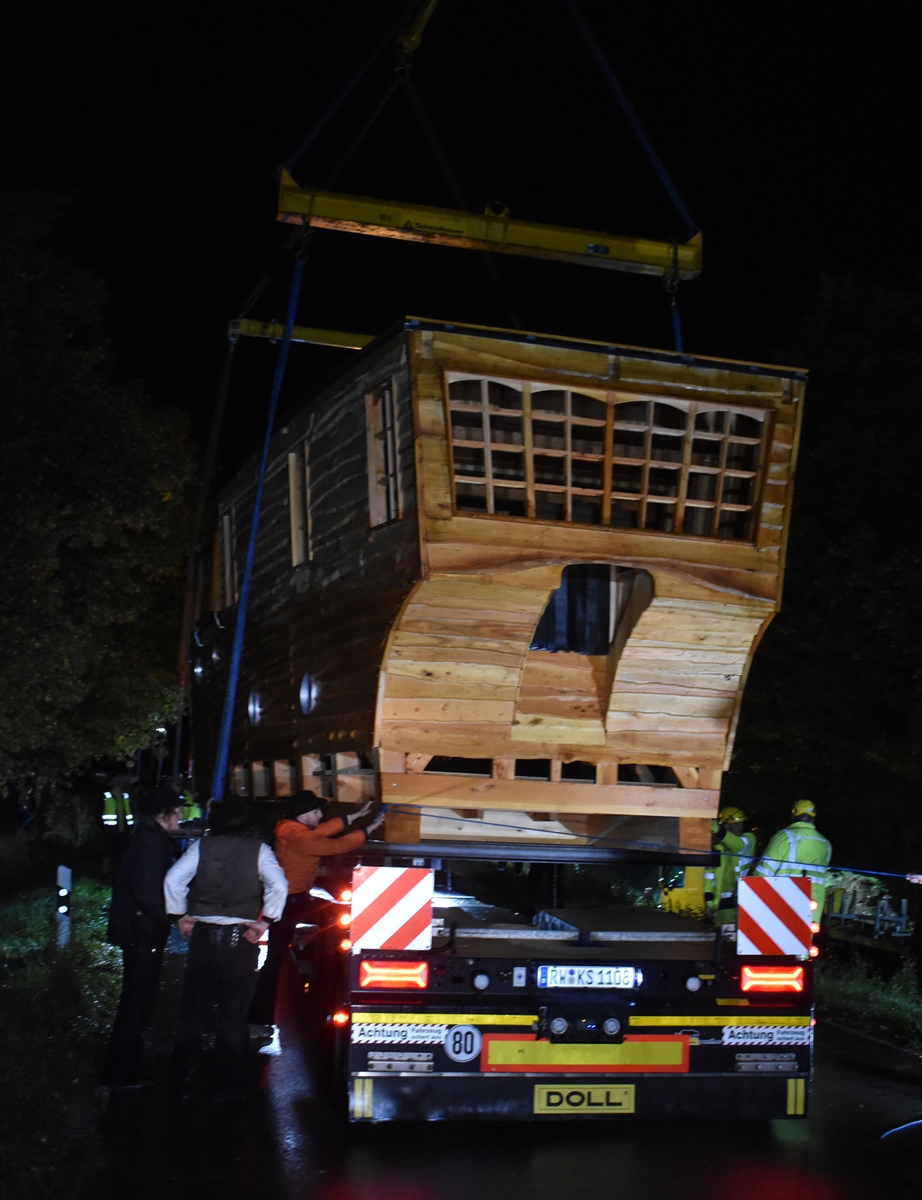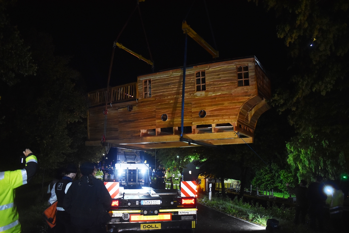 Für die Schwertransporte gelten besondere Regeln. Und schwer ist das Schiff, auch wenn es nicht nach Bruttoregister-, sondern nur nach Tonnen gewogen wird. In zwei Teilen wurde das Piratenschiff transportiert, allein das Heck wiegt zehn Tonnen. Im Einsatz: Ein Schwertransporter, zwei Krane, mehrere Begleitfahrzeuge. Darunter welche von der Polizei, denn die muss Schwertransporte begleiten.
