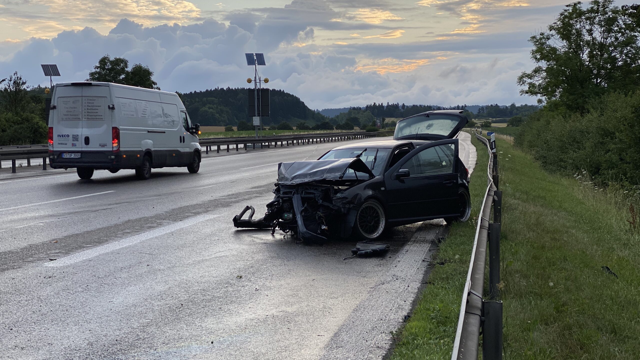 Der Golf schlug dann zunächst wuchtig links in die Mittelleitplanke ein. Anschließend noch zwei mal in die Leitplanke rechts. Völlig demoliert kam der Wagen dann auf der Standspur zum Stehen.