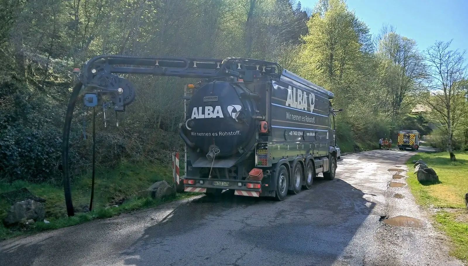 Am Parkplatz an der B 294 schwamm der Diesel beim Eintreffen des Umweltschutzamtes gut sichtbar auf mehreren großen Pfützen. Der Geruch war deutlich – und mit Öl-Testpapier nachweisbar. Damit der Diesel bei erneutem Regen nicht wieder ins Gewässer gelangt, musste das Landratsamt schnell handeln. Die Firma Alba spülte den Entwässerungskanal und saugte das verunreinigte Wasser ab.