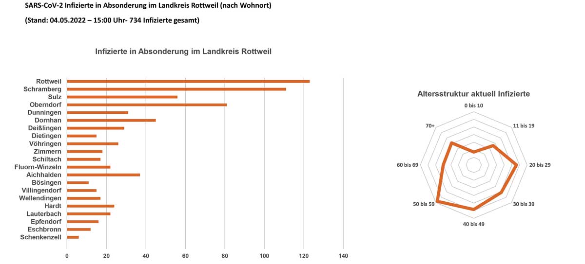 Seit vier Wochen sind die Inzidenzen im Landkreis unter dem Durchschnitt des Landes, berichtete Dr. Adam – das Hoch sei Mitte März gewesen mit einer Sieben-Tage-Inzidenz von 4000. Inzwischen sei die größte Altersgruppe unter den Infizierten 50 bis 59. Bei Kindern seien fast keine Corona-Infektionen mehr gemeldet worden – was Adam auch darauf zurückführt, dass nur noch Kinder mit Symptomen getestet würden. Die aktuelle Inzidenz: 370.
