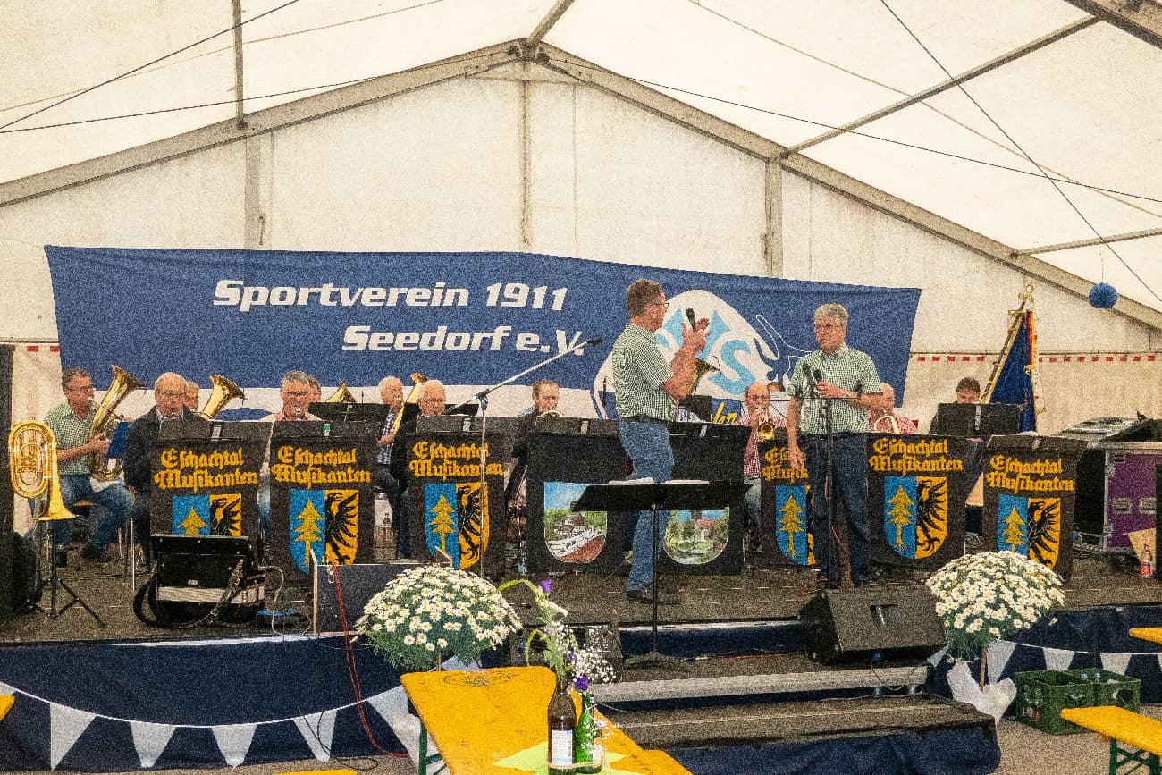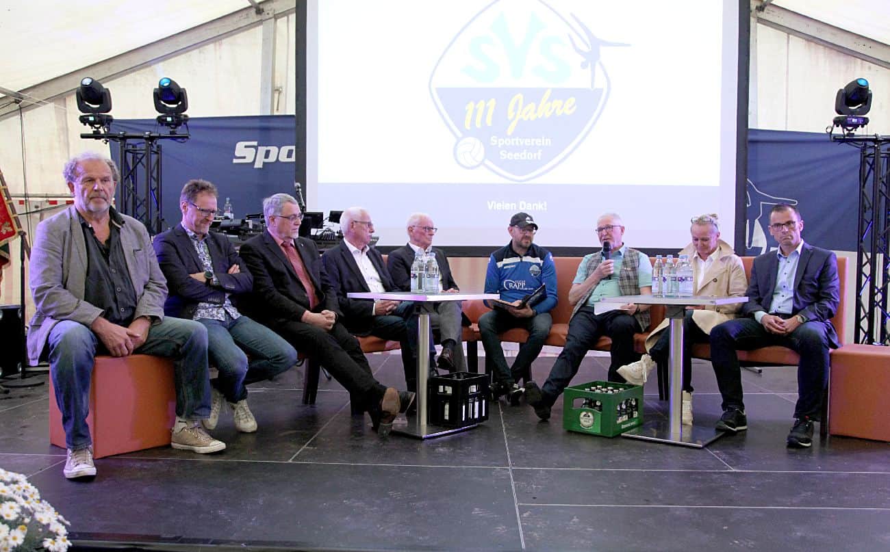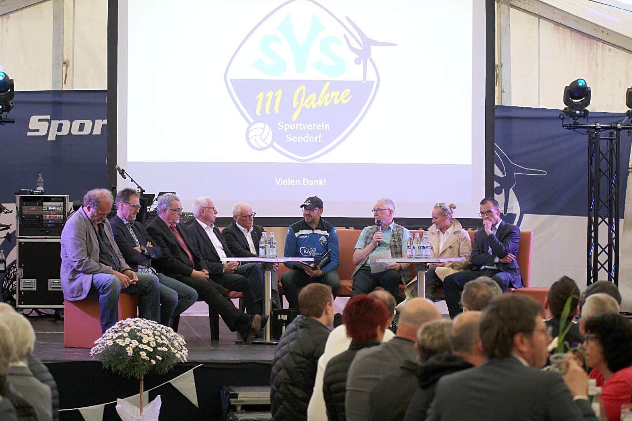 In einer lockeren Talkrunde unterhielten sich die anwesenden und bereits genannten Funktionsträger über die außergewöhnliche Geschichte des SV Seedorf, der sich speziell in den letzzten zwanzig Jahren vom Fußballverein zu einem breiten „Mehr-Spartenverein“ entwickelt hat. „Der SV Seedorf ist mit seinem Sportzentrum zu einem Vorbild im Verbandsgebiet geworden“, so Marcus Lachenwitzer vom WLSB. Auch die personelle Entwicklung und die Mitgliederzahl seien beachtlich. Derzeitiger Mitgliederstand: 1900.