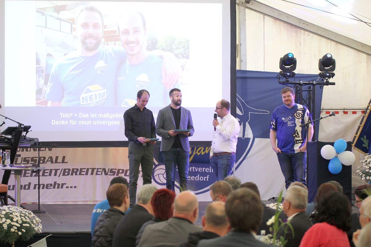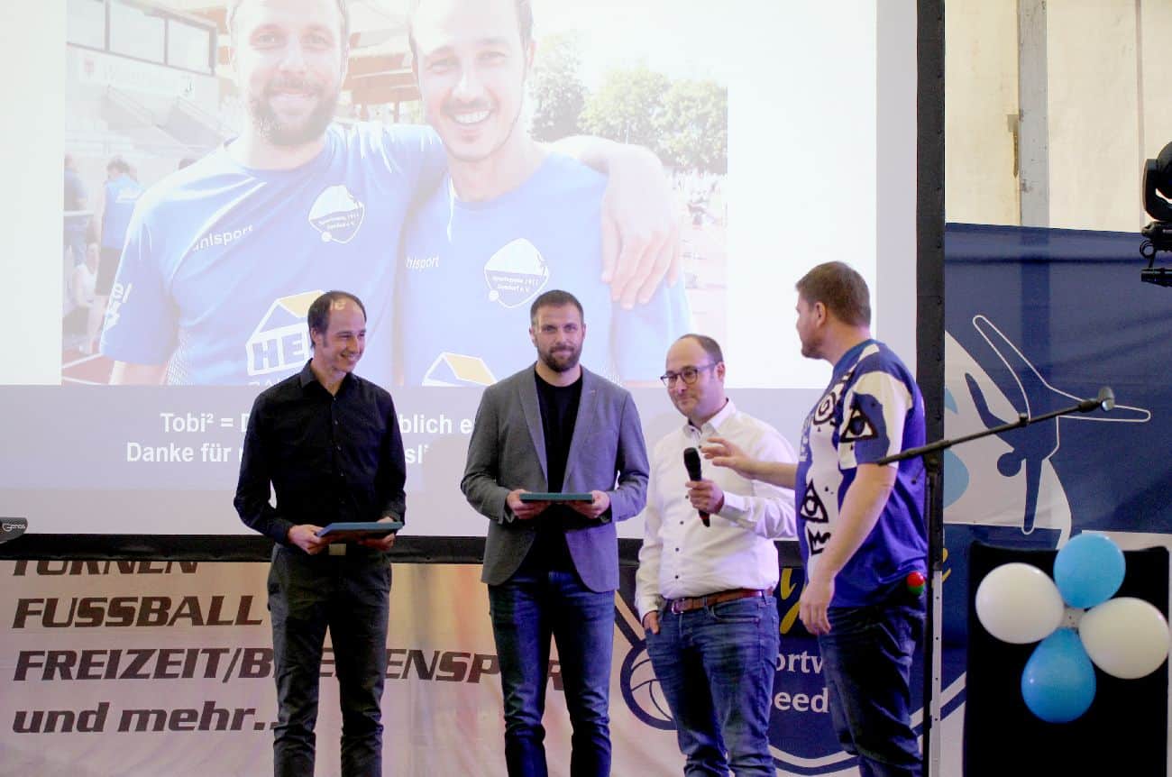 Verabschiedet wurden auch die beiden Trainer der ersten Mannschaft Tobias Bea und Tobias Heizmann, die neun Jahre lang das Team trainierten und 2017 in die Landesliga führten.