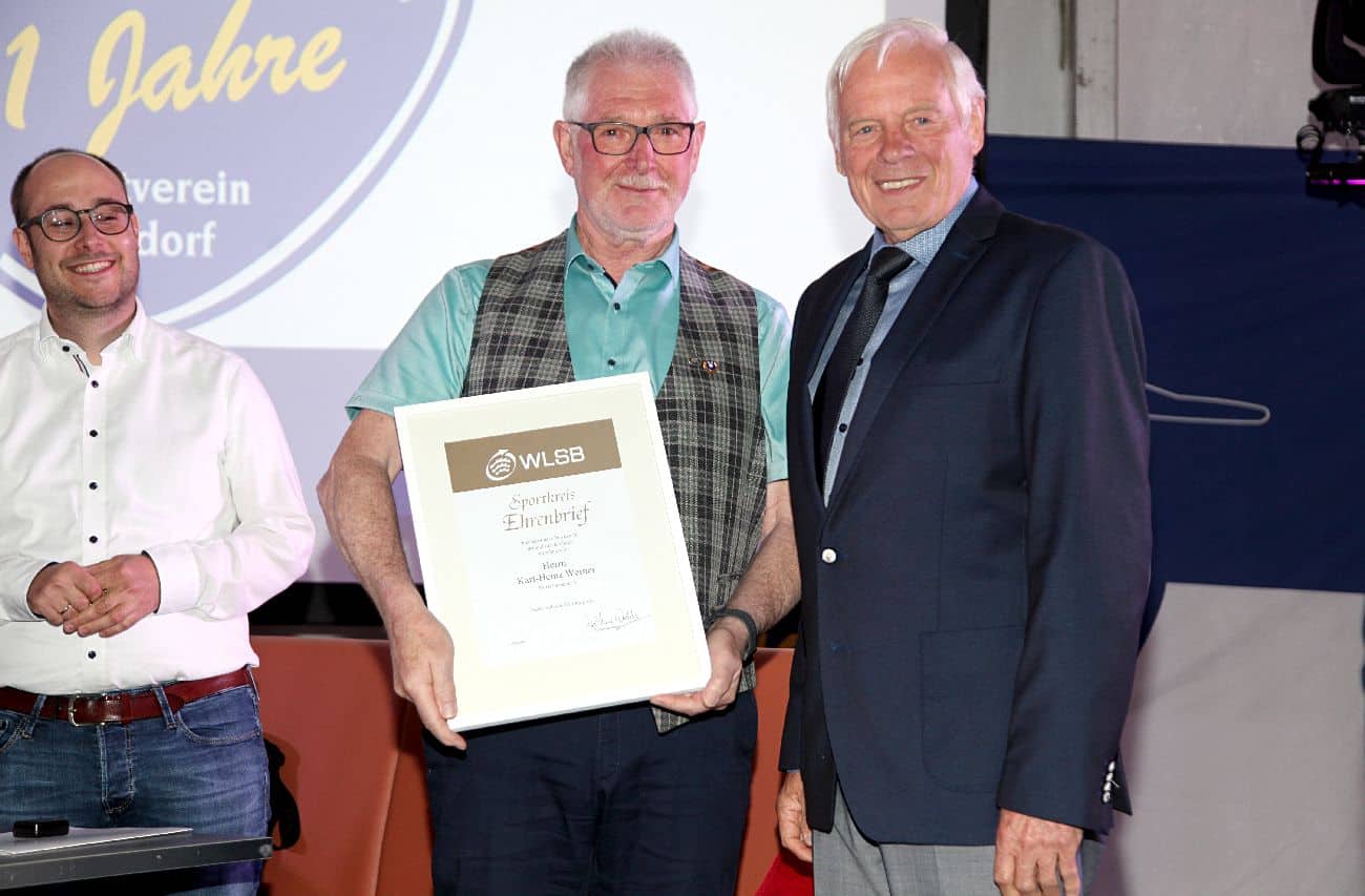 Die verschiedenen Laudatoren bezeichneten ihn als Pionier, Visionär, Motivator … Bis zu seiner Verabschiedung beim Festakt – alle Besucher im Festzeit hatten sich erhoben – hat Werner den fit.S Sportpark geleitet. Von der gesamten SV S-Familie erhielt er als Dank ein gerahmtes Porträt sowie eine Gartenbank. Karl-Heinz Werner durfte an diesem Abend nicht nur Worte entgegennehmen, sondern auch zwei hochkarätige Ehrungen: die Verdienstnadel des Deutschen Fußballbundes und den Ehrenbrief des Sportkreises Rottweil.